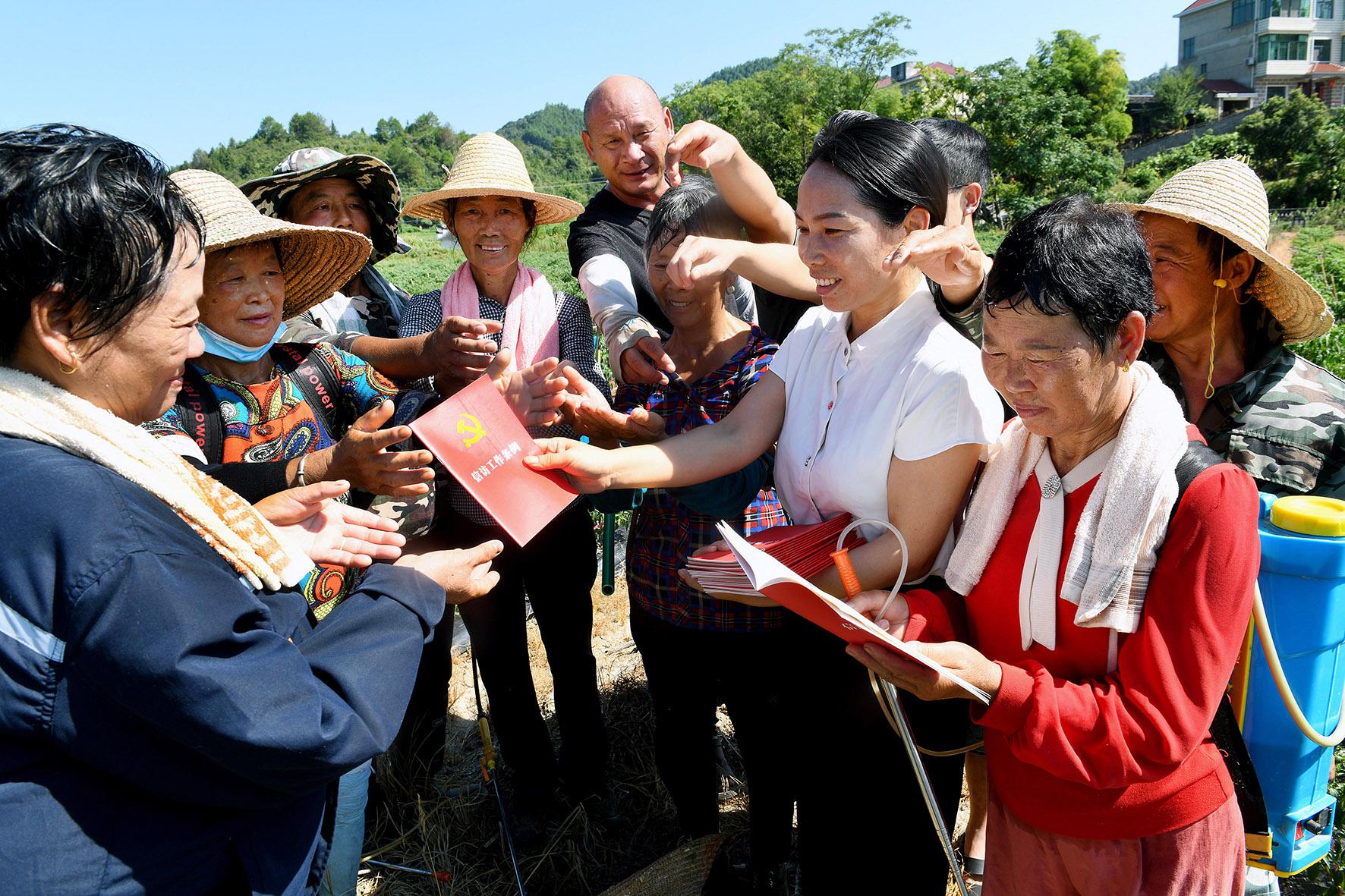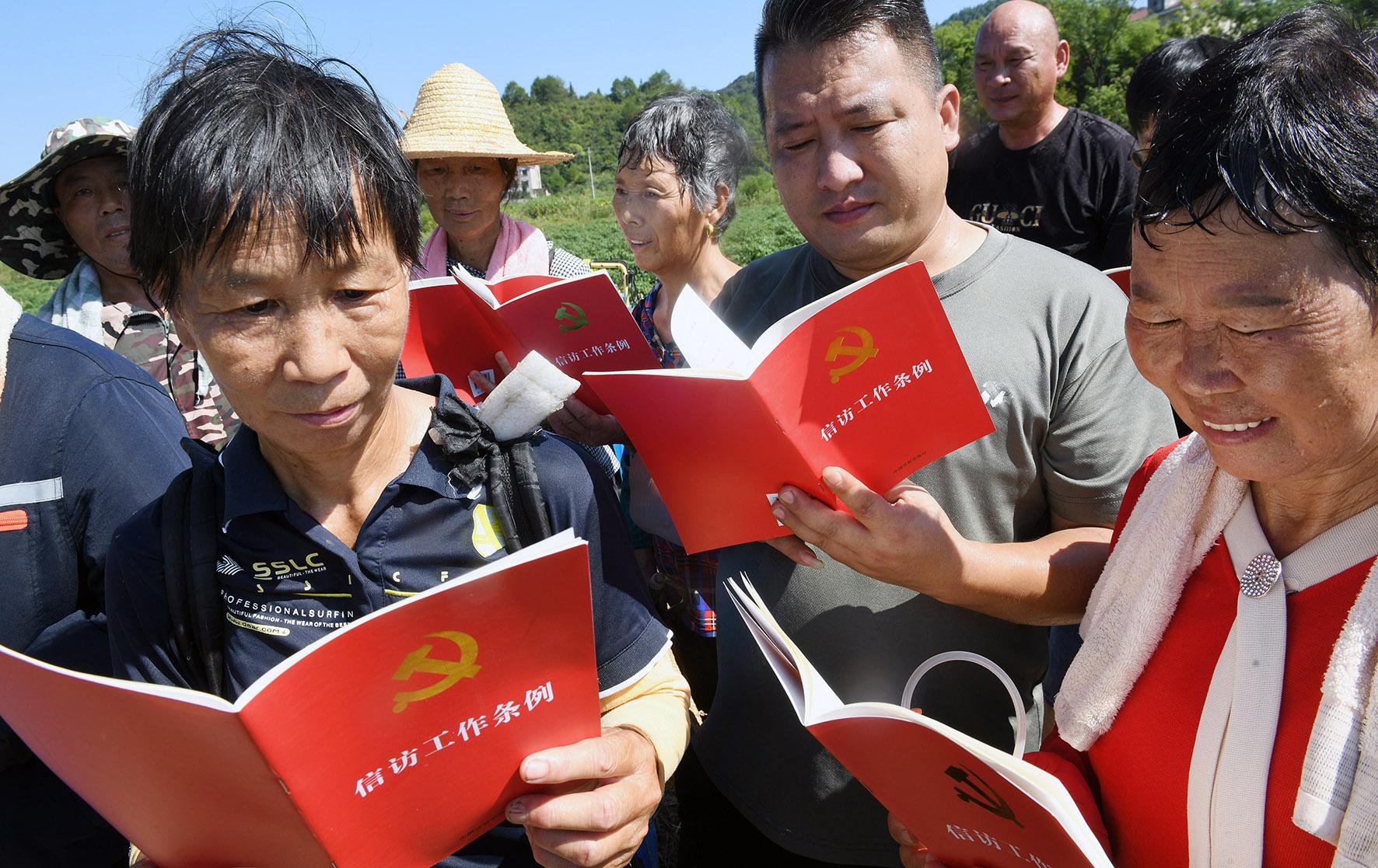 8月27日,江西省德興市新崗山鎮(zhèn)信訪干部在西坑村田間地頭,現(xiàn)場分發(fā)《信訪工作條例》,引導(dǎo)村民依法信訪。