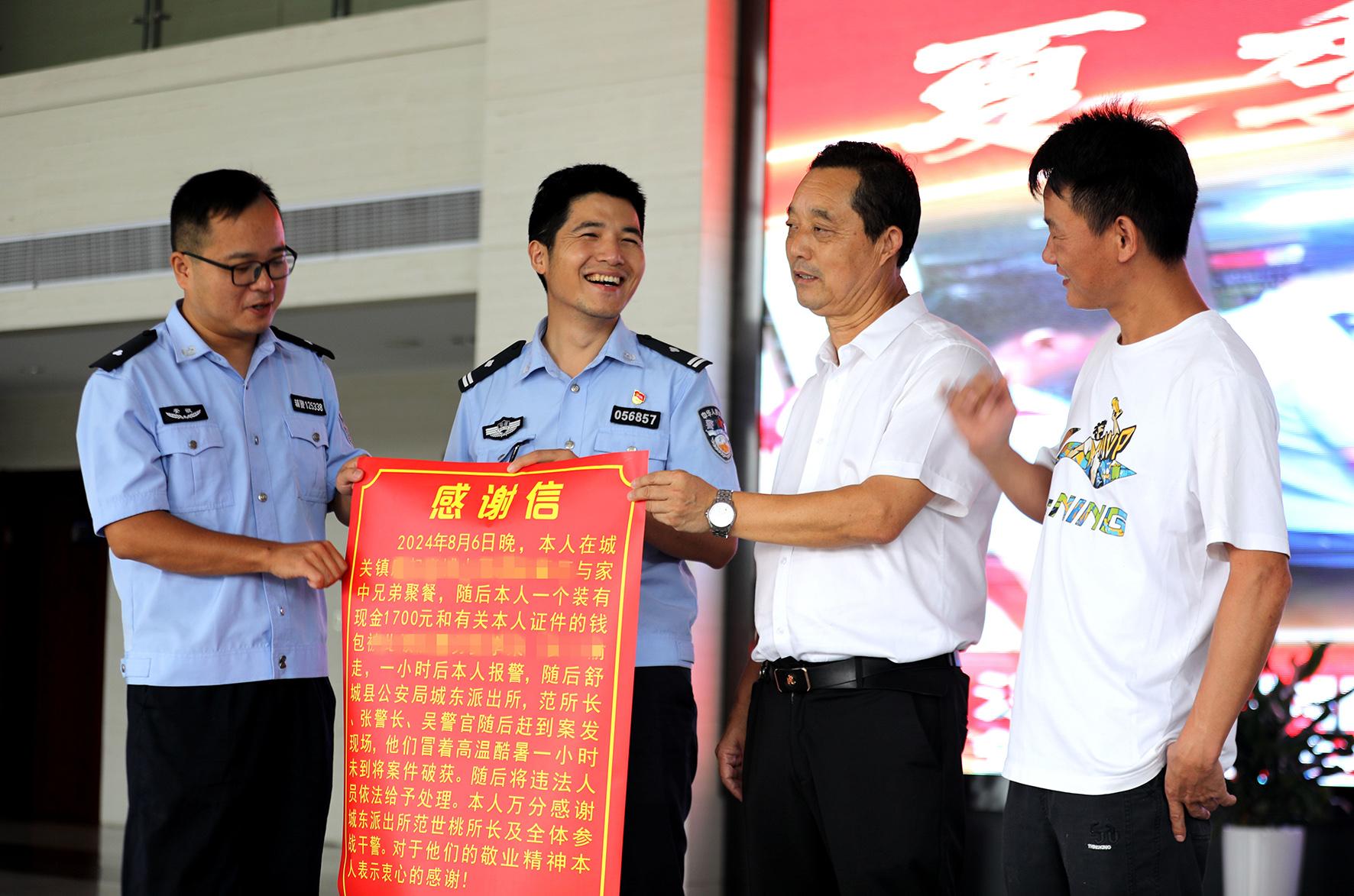 “我要把這封‘走心’的感謝信,送給‘用心’的警官們!”9月3日,家住安徽省舒城縣城關(guān)鎮(zhèn)的周先生手持“超大號”感謝信來到舒城縣公安局城東派出所,感謝民警快速破案并幫其找回財物。