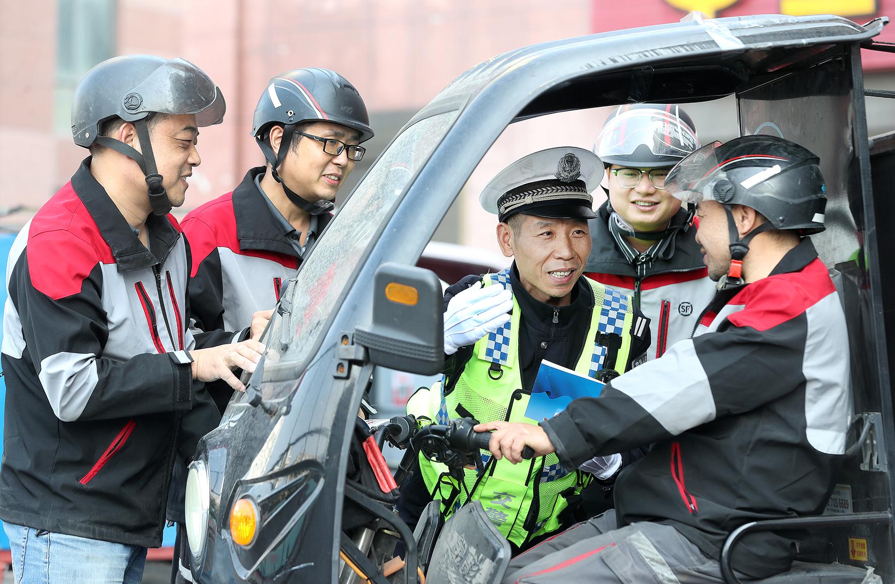 11月11日中午,湖北省荊門(mén)市公安局交警支隊(duì)東寶大隊(duì)民警在一家快遞公司,叮囑快遞“小哥”攬件、送件從“頭”做起,保護(hù)好自己以及他人的生命財(cái)產(chǎn)安全。
