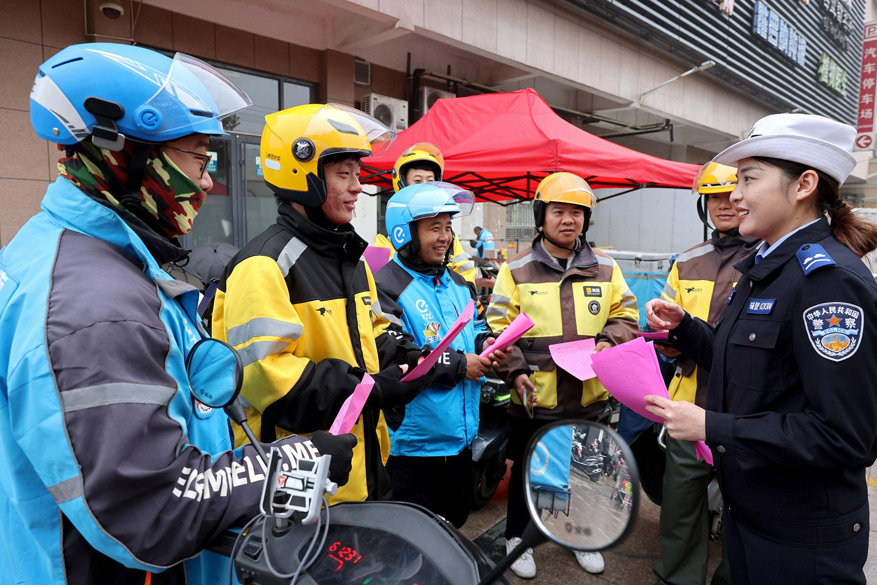 針對外賣配送員、快遞員等群體容易出現(xiàn)的邊騎車邊接打電話、隨意穿插機(jī)動車道、超速行駛等危險(xiǎn)行為,山東省棗莊市公安局市中分局交通警察大隊(duì)組織民輔警每周一次巡回給他們上交通安全課,提高他們的交通安全意識,從源頭上預(yù)防和減少道路交通事故的發(fā)生。
