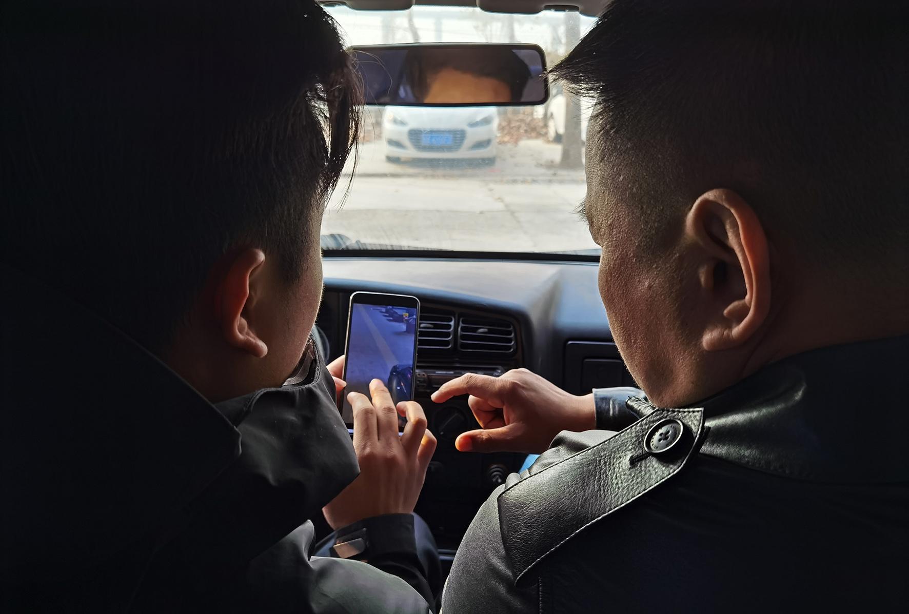 1、偵查行動隊民輔警在路上查看在逃人員信息。