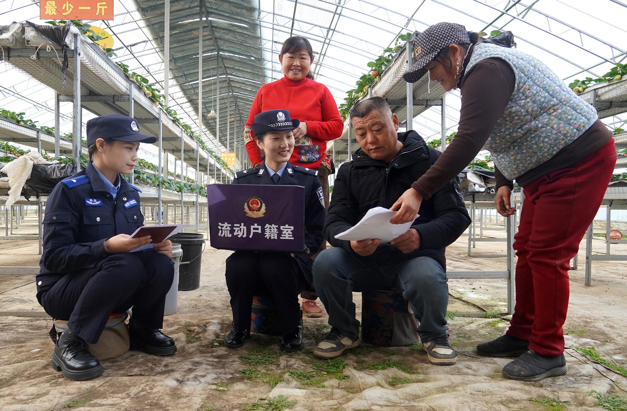 12月12日,山東省棗莊市公安局薛城分局鳳鳴湖派出所“流動(dòng)戶籍室”民輔警在轄區(qū)高樓村大棚種植基地為農(nóng)戶辦理戶籍業(yè)務(wù)。