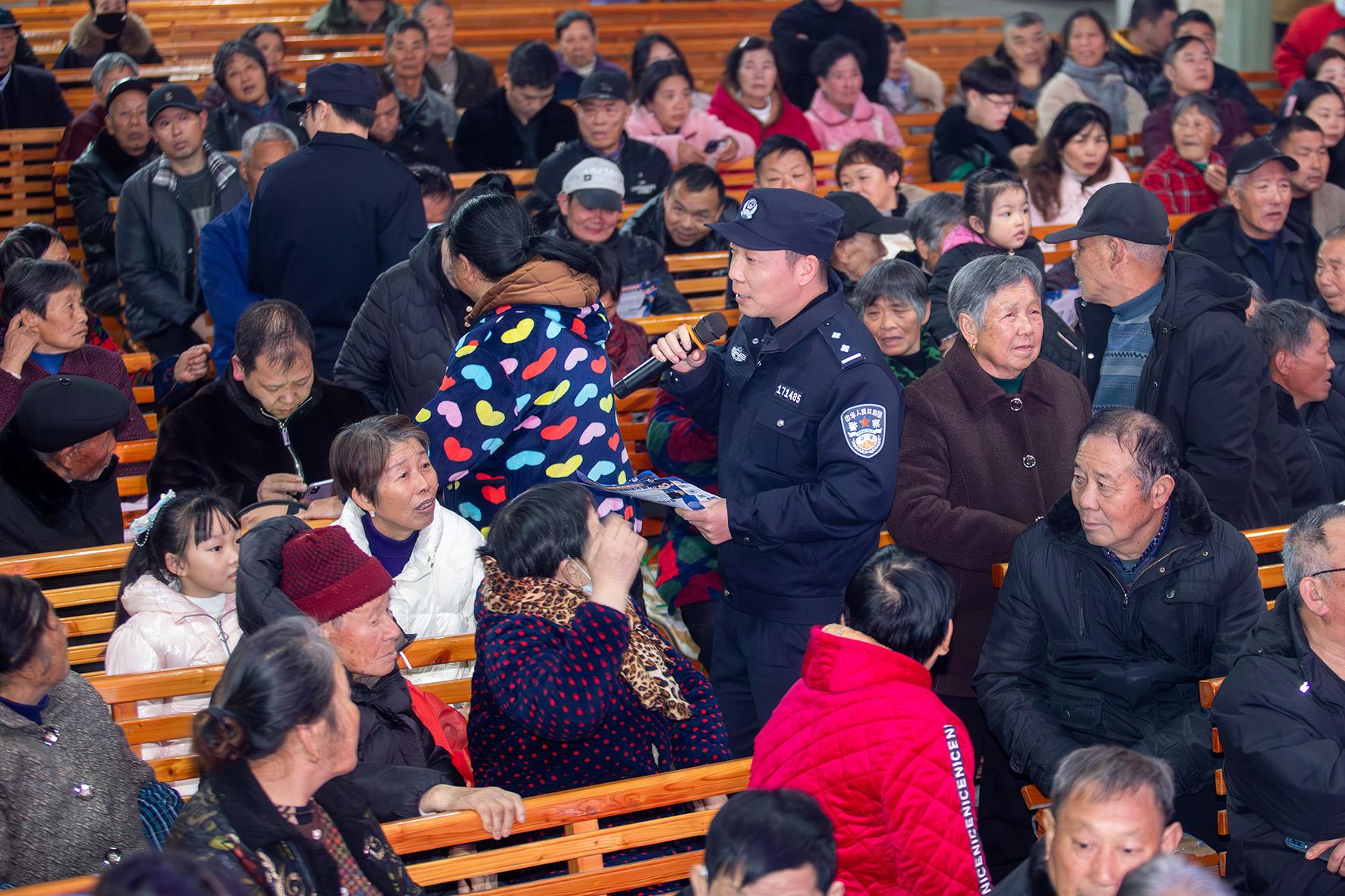 12月25日夜,浙江省臺州市公安局黃巖分局城西派出所民警來到羅家匯村社戲現(xiàn)場,向村民開展防范電信網(wǎng)絡(luò)詐騙知識宣傳。