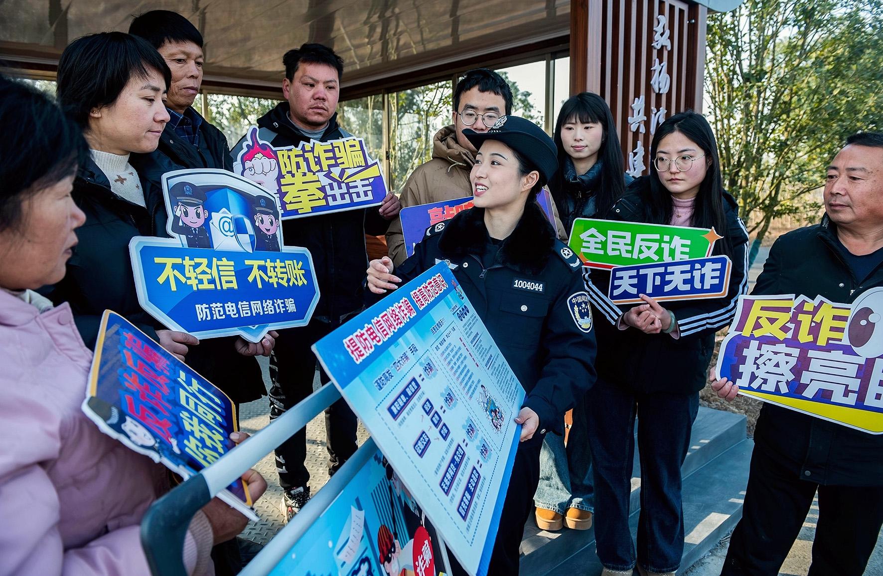 1月13日,安徽省含山縣司法局普法工作者在凌家灘景區(qū)向游客宣傳防范網(wǎng)絡(luò)電信詐騙知識(shí)。年關(guān)將至,含山縣司法局組織開(kāi)展“全民反詐同行 共筑平安家園”主題宣傳活動(dòng)。