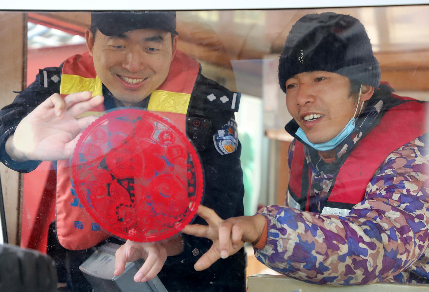 1月16日,長(zhǎng)江航運(yùn)公安局南通分局通州派出所組織警力對(duì)靠泊作業(yè)船舶進(jìn)行安全巡查,并送上新春祝福。