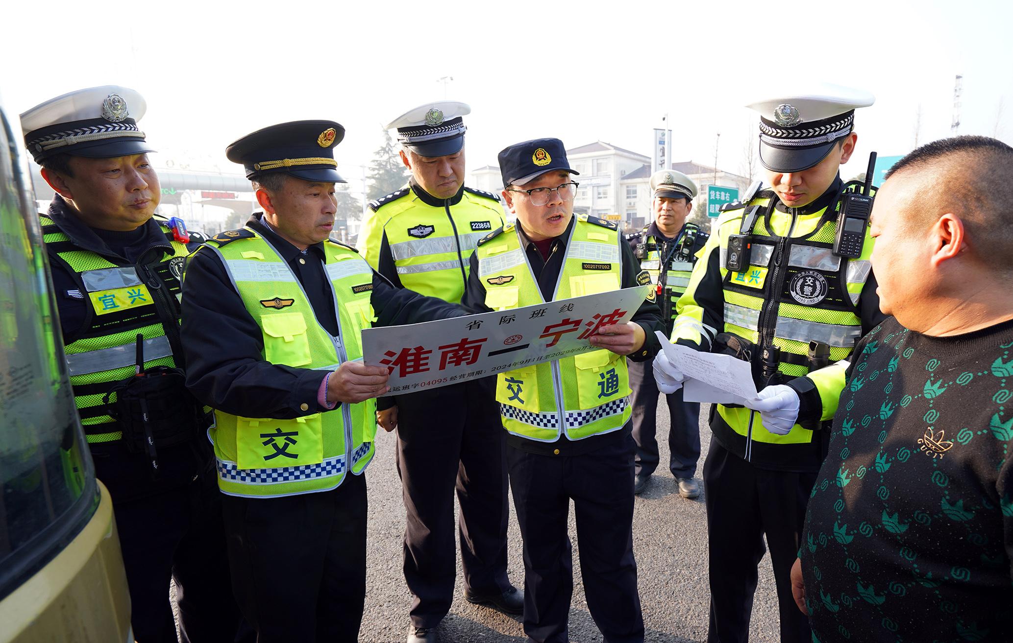 圖為1月21日,執(zhí)法人員在長(zhǎng)深高速宜興站對(duì)過往“兩客一?!避囕v開展檢查。
