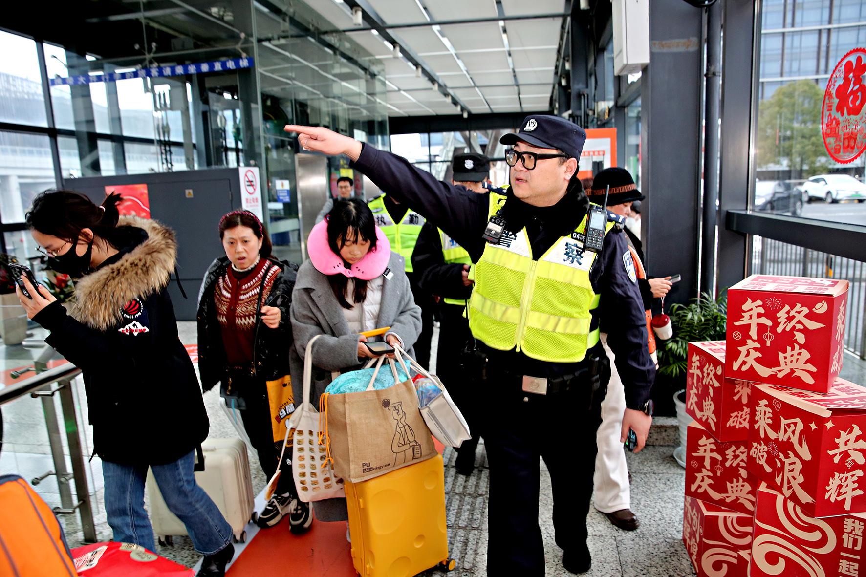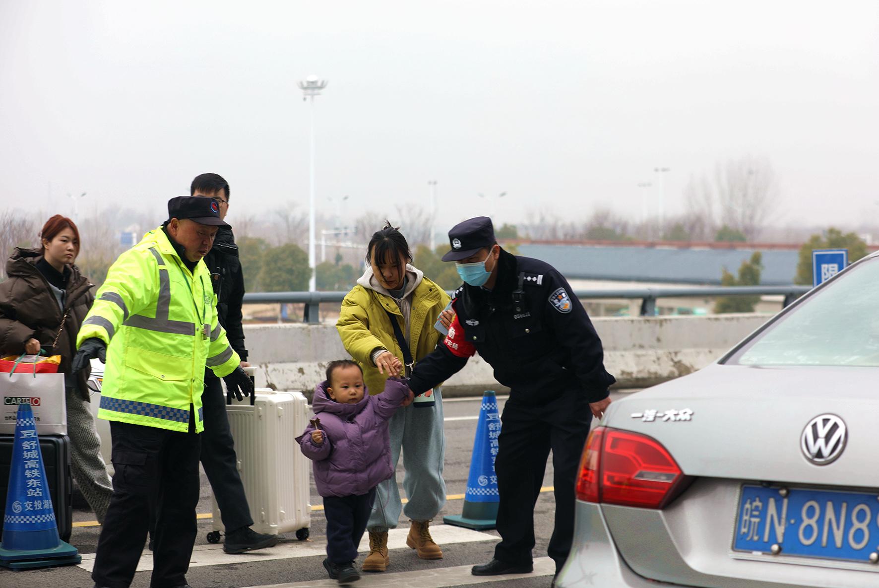 2月3日,農(nóng)歷正月初六。安徽省舒城縣高鐵東站迎來返程高峰。舒城縣公安局千人橋派出所高鐵東站警務(wù)站民警輔警在入站口平臺疏導(dǎo)交通、服務(wù)群眾,確保返程旅客平安出行。