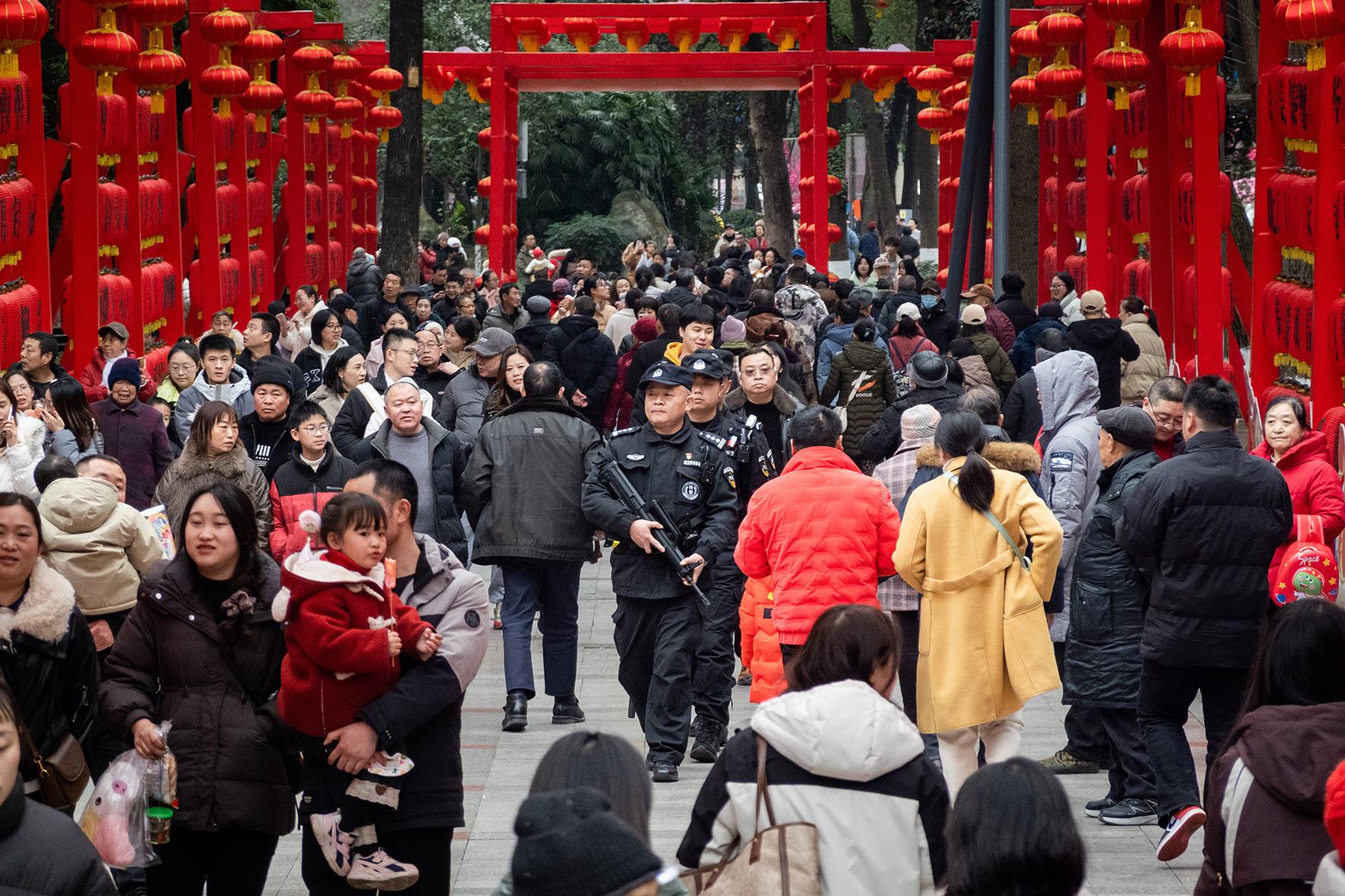 1月29日,大年初一。浙江省臺州市公安局黃巖分局巡特警大隊(duì)民警在景區(qū)巡邏。