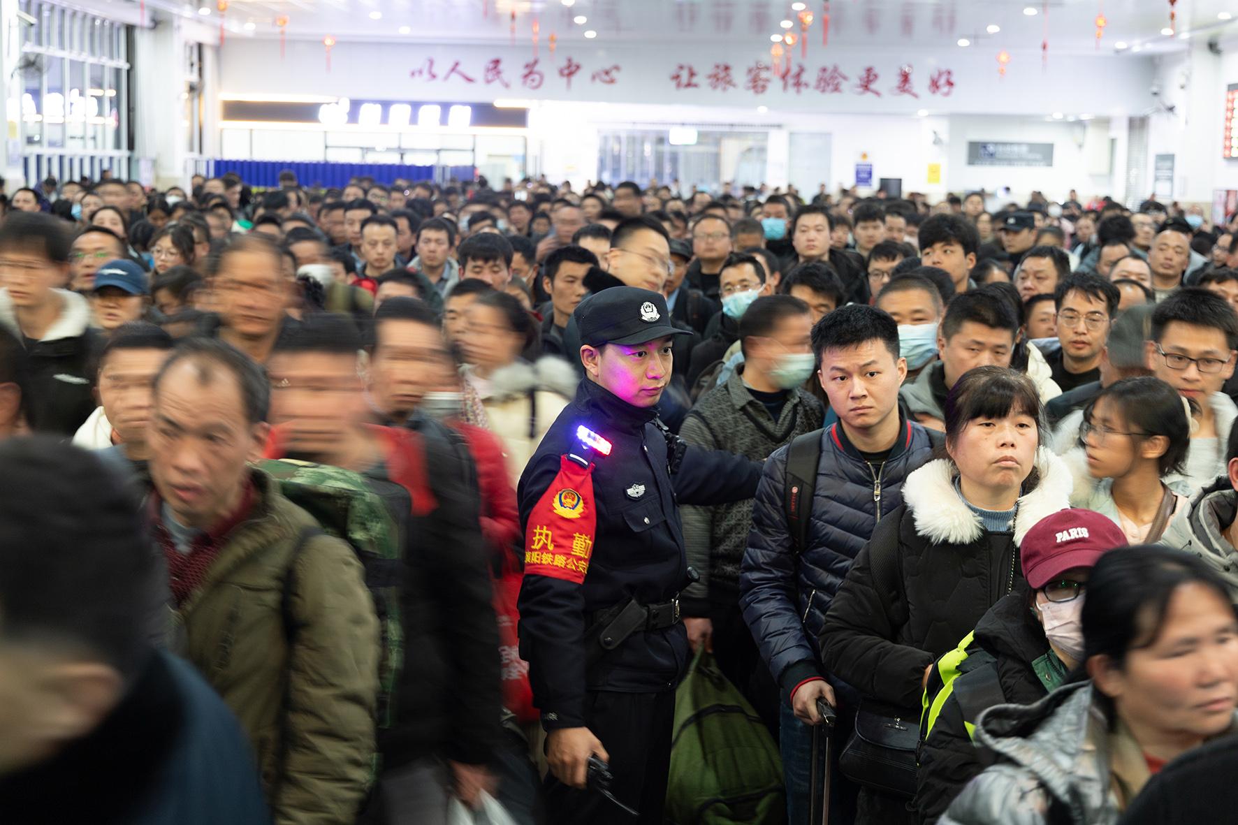 2月2日,廣西柳州鐵路公安處融水站派出所執(zhí)勤民警堅(jiān)守崗位,護(hù)送旅客平安出行。