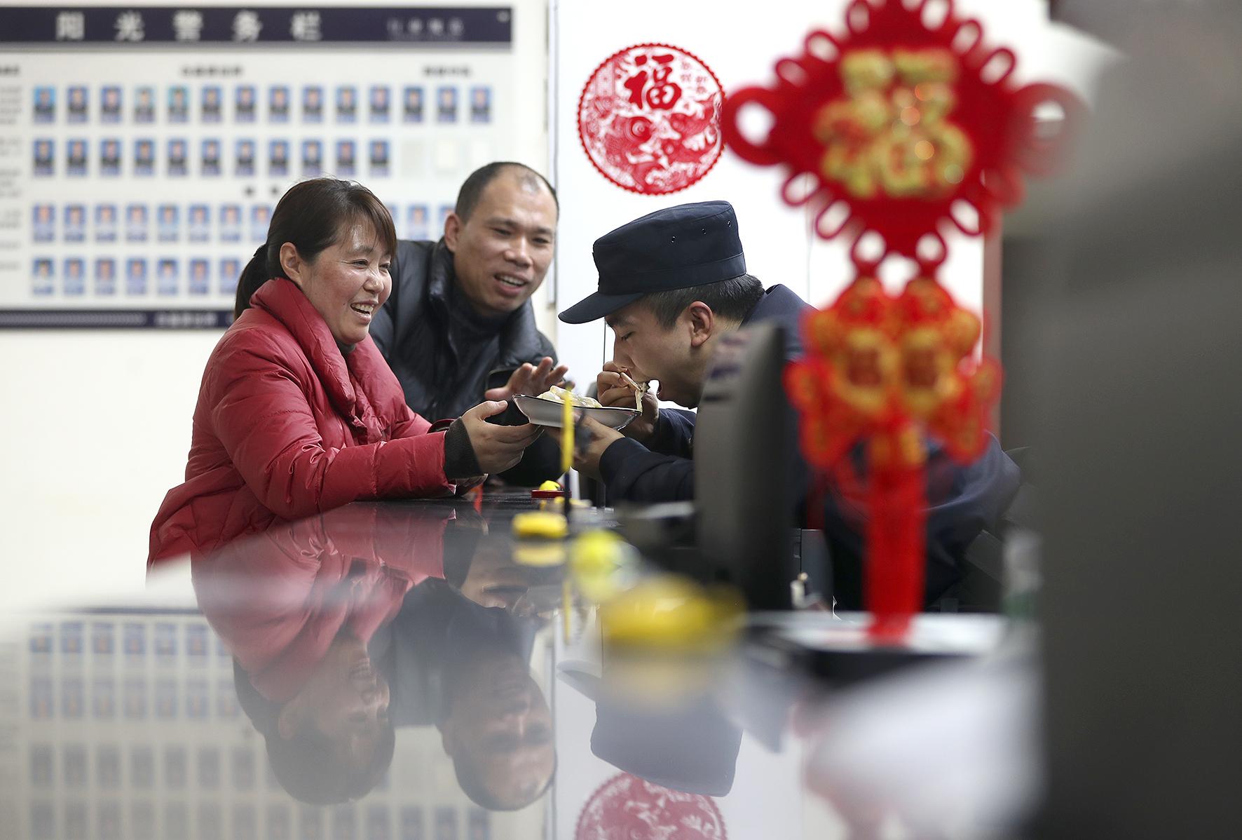 1月28日,除夕夜。在湖北省荊門市公安局高新區(qū)·掇刀區(qū)分局白廟派出所,新警陳科橋父母送來熱乎乎的餃子,讓第一次春節(jié)值班的陳科橋和同事們吃上溫馨的“年夜飯”。