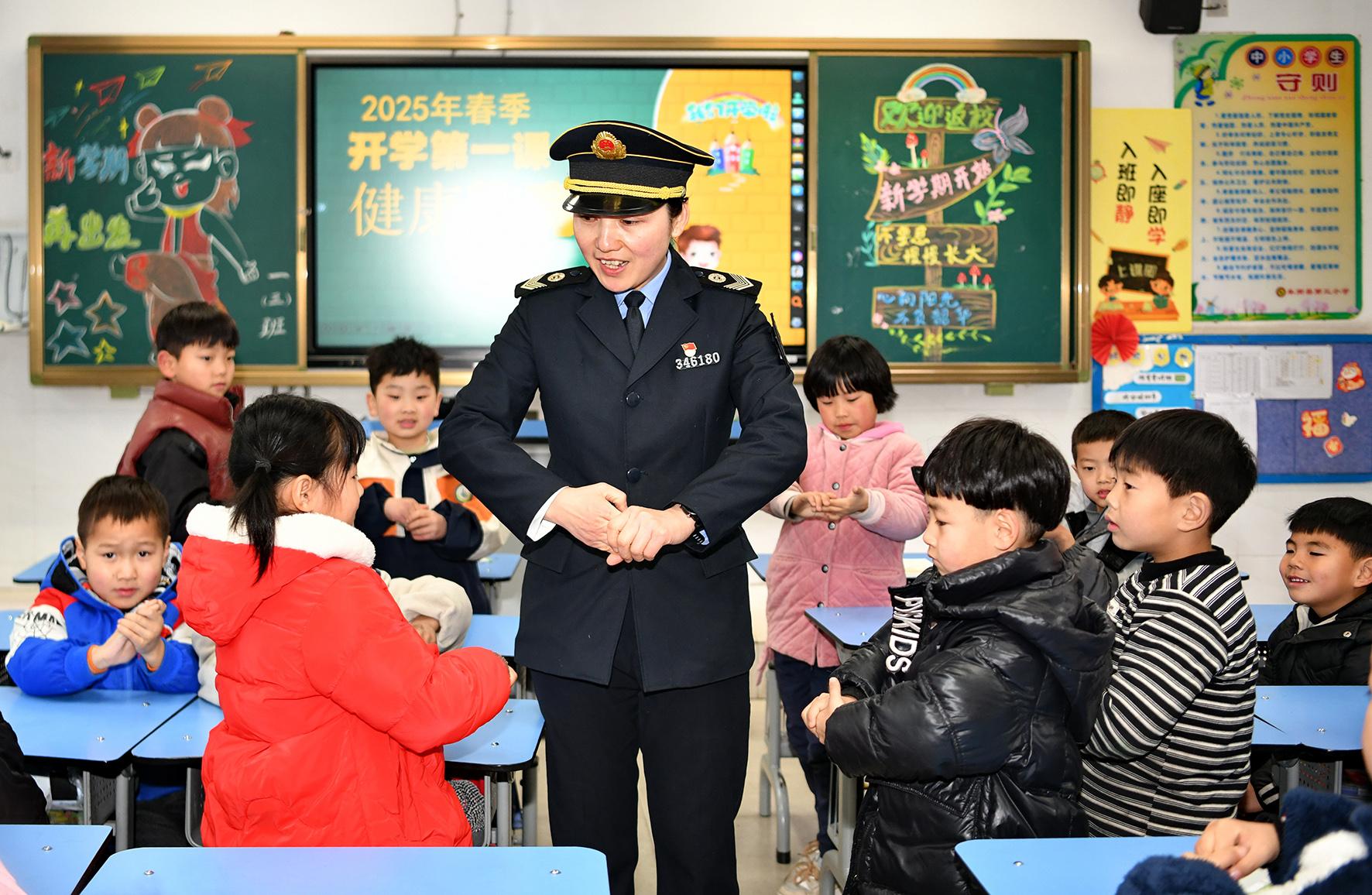 2月14日,安徽省阜南縣衛(wèi)生監(jiān)督員在第三小學(xué)向?qū)W生們講解學(xué)校衛(wèi)生知識。春季開學(xué)之際,阜南縣疾病預(yù)防控制局組織監(jiān)督員走進轄區(qū)中小學(xué)校開展傳染病防控、預(yù)防近視和勤洗手等學(xué)生衛(wèi)生知識宣講,增強學(xué)生們自我健康防護意識。