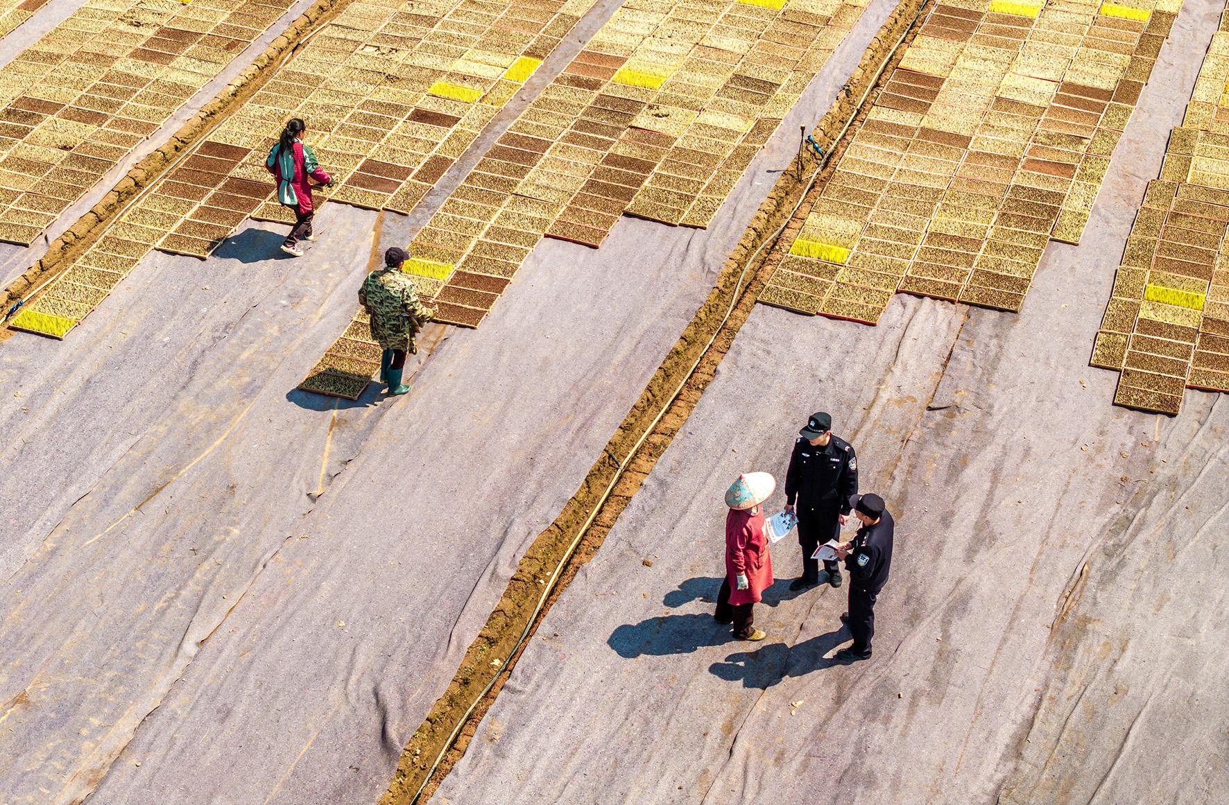 圖為3月19日,民警輔警在育秧基地走訪,向村民進(jìn)行反詐宣傳。