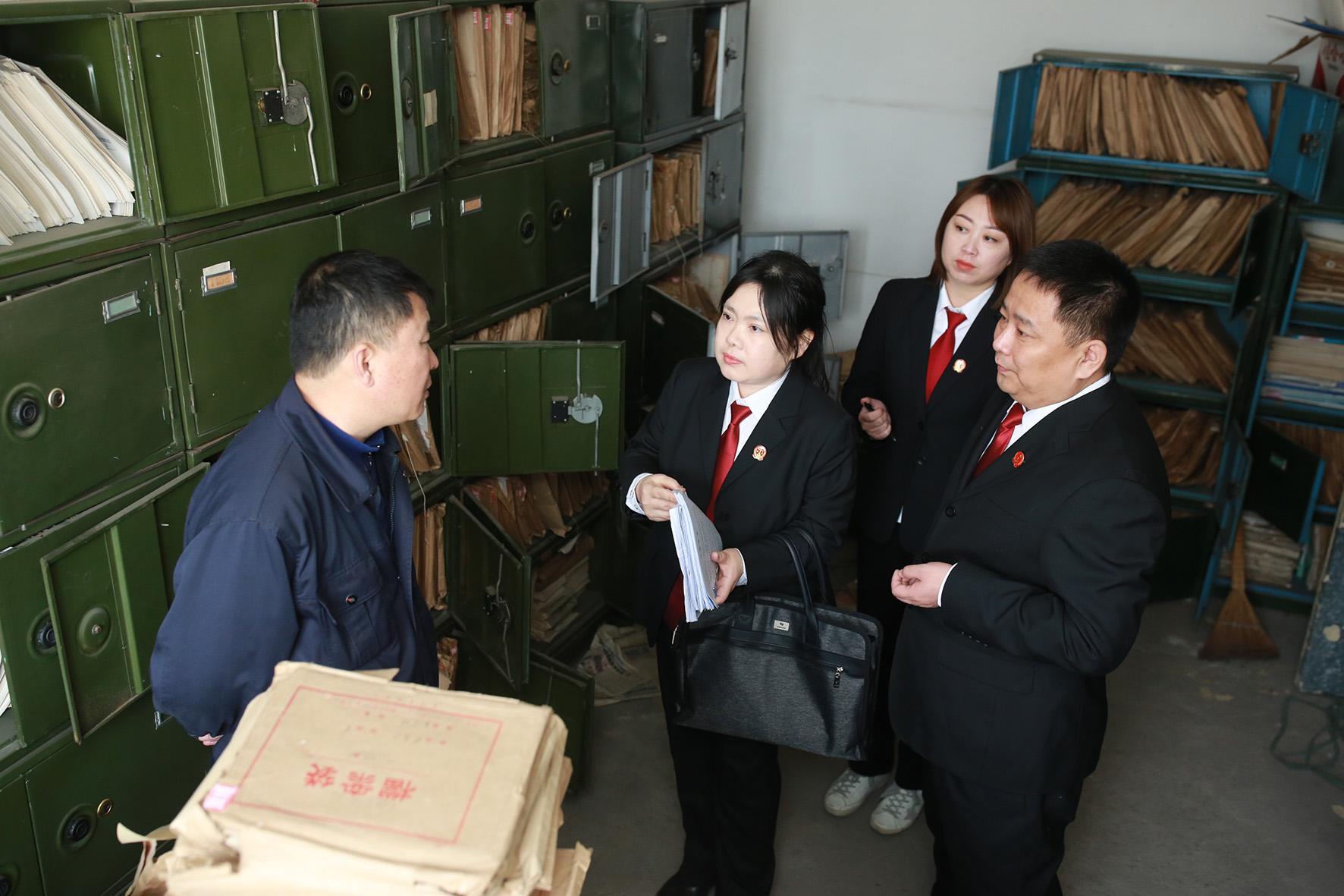 圖為3月31日,法官在審理特殊工種職工申請?zhí)崆巴诵莅讣r(shí),到企業(yè)查閱職工檔案,調(diào)查證據(jù)。