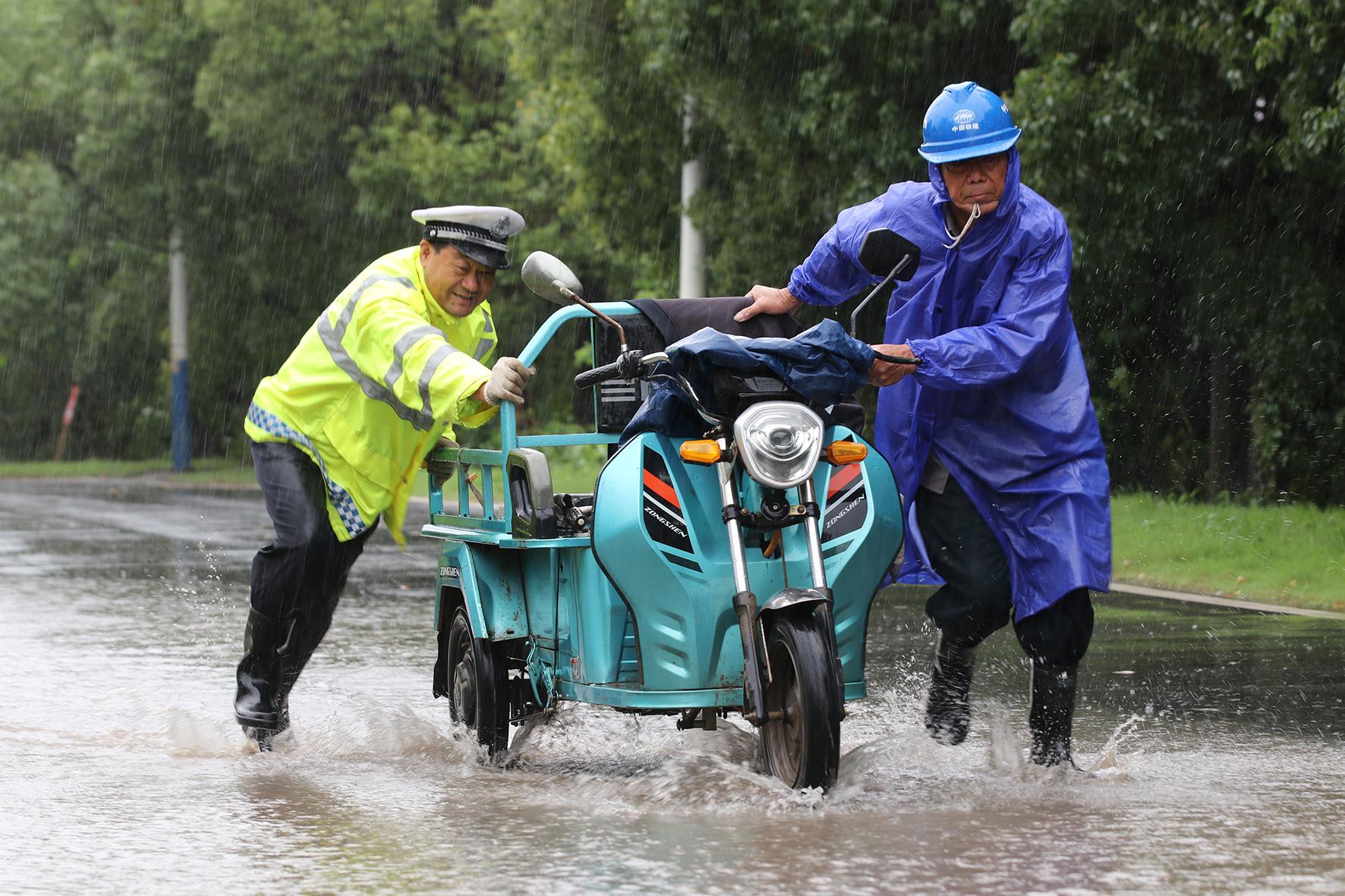 圖為民警在二壩鎮(zhèn)長江路幫助村民將故障三輪車推出積水路面。