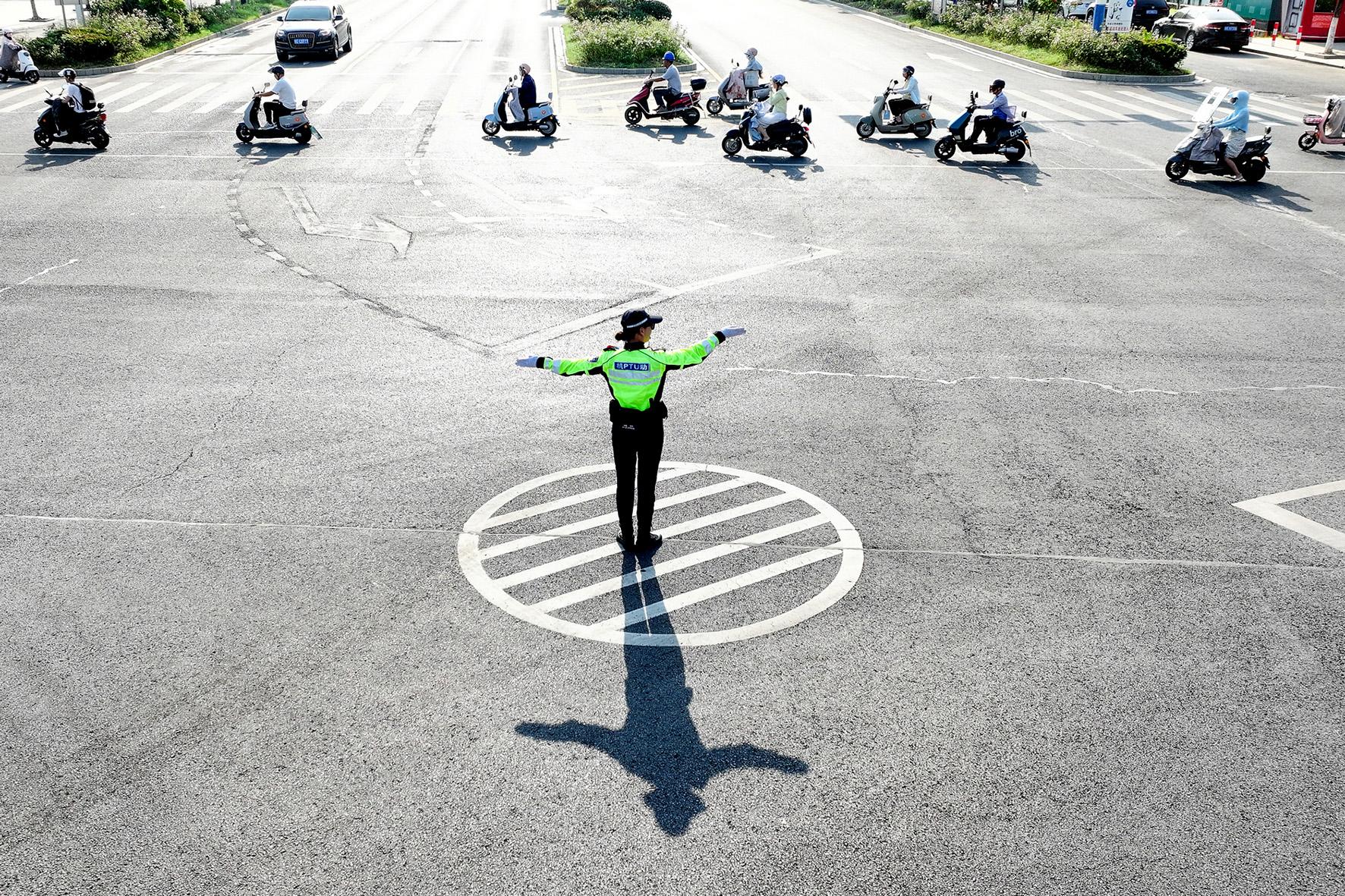 7月7日,安徽省馬鞍山市和縣公安局交警大隊(duì)民警在烈日下指揮疏導(dǎo)交通。