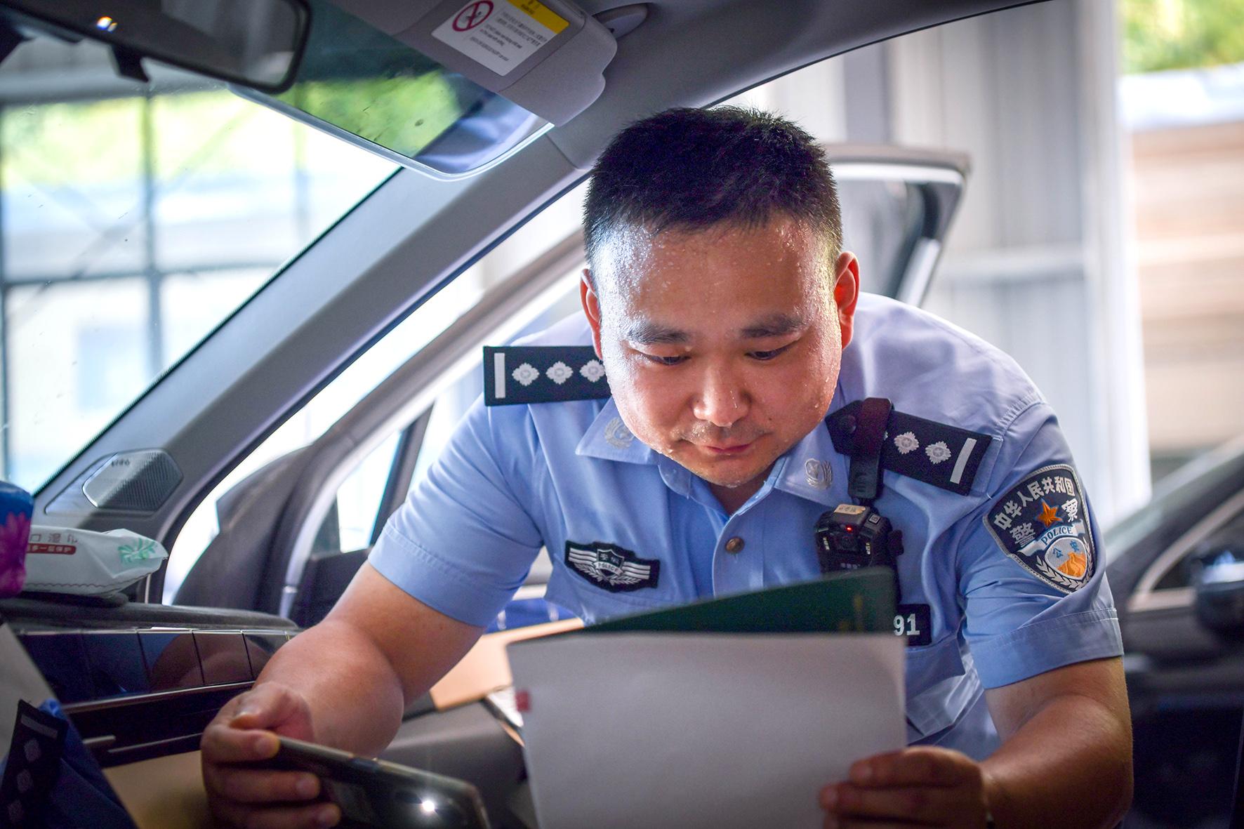 7月7日,小暑節(jié)氣。安徽省涇縣公安局交管大隊(duì)車管所民警在高溫下認(rèn)真檢查車輛信息。