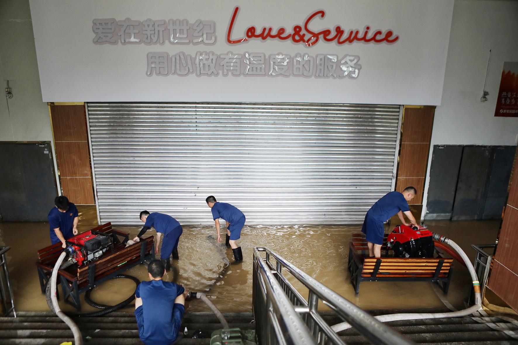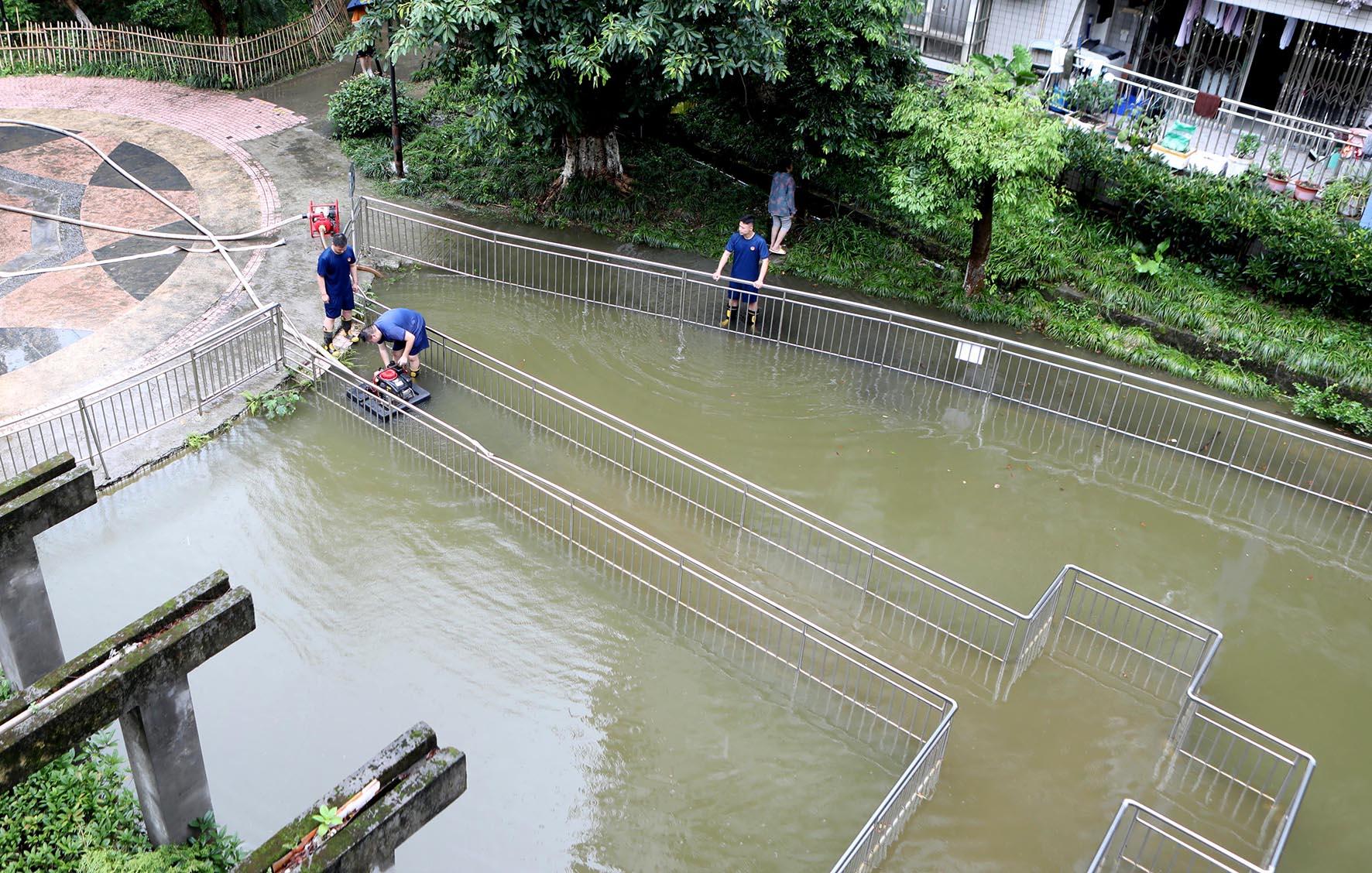 7月9日,重慶市永川區(qū)應(yīng)急救援人員在城區(qū)低洼地段、地下停車庫等受災(zāi)區(qū)域進(jìn)行排水作業(yè)。