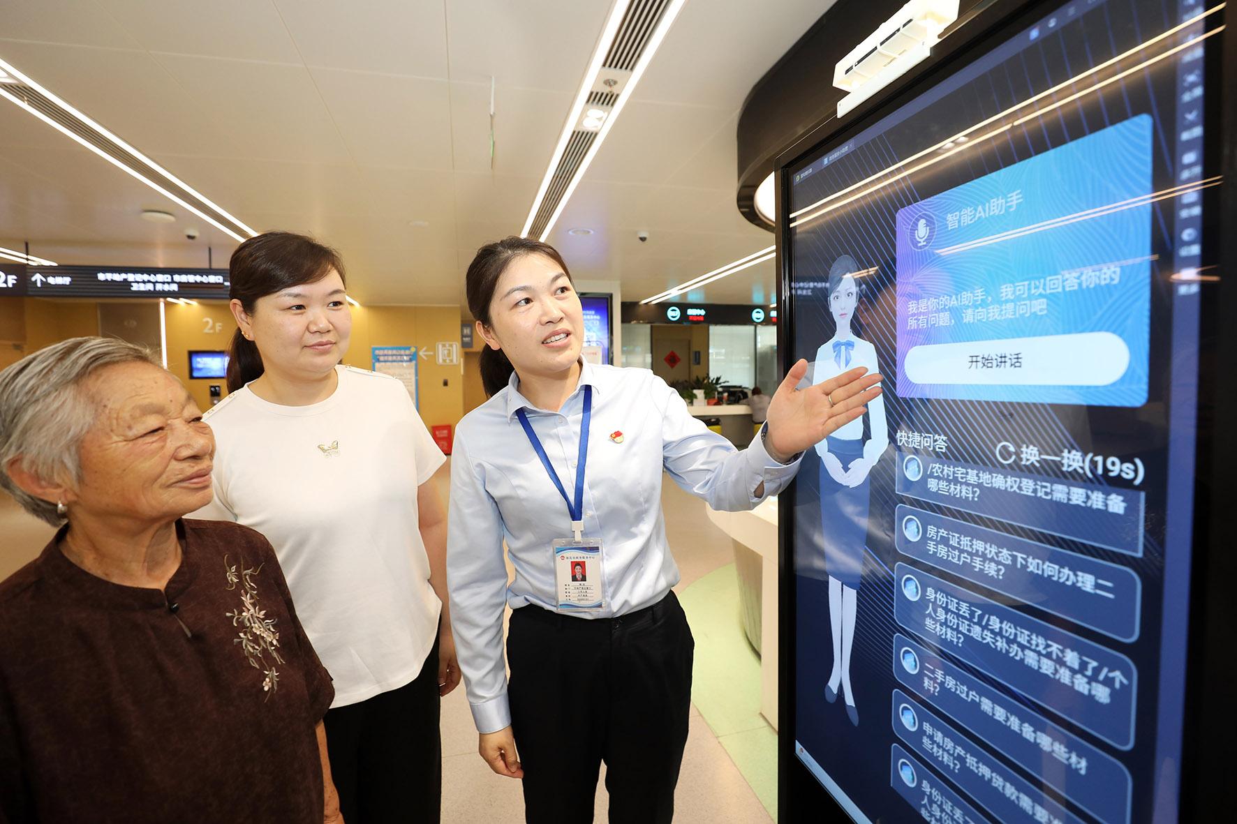 7月15日,安徽省淮北市政務服務大廳不動產登記窗口工作人員利用“智能AI助手”指導辦事群眾進行咨詢業(yè)務。當日,淮北市政務服務大廳不動產登記窗口“智能AI助手”投入使用,設備具有智能詢問解答導服功能,支持辦事群眾通過快捷、語音等多種方式進行交互。