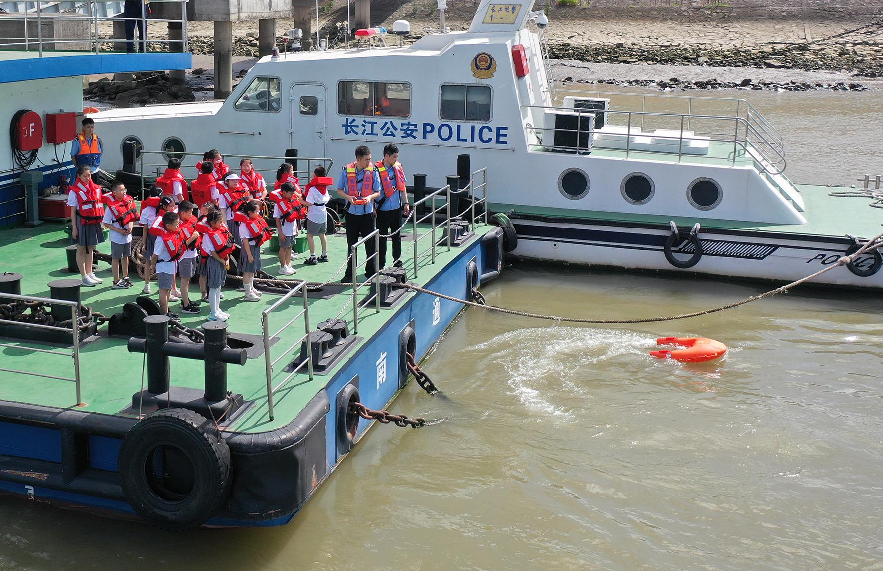 7月23日,長江航運公安局南通分局通州派出所民警在水上執(zhí)法基地為愛心暑托班的孩子們宣講防溺水安全知識。