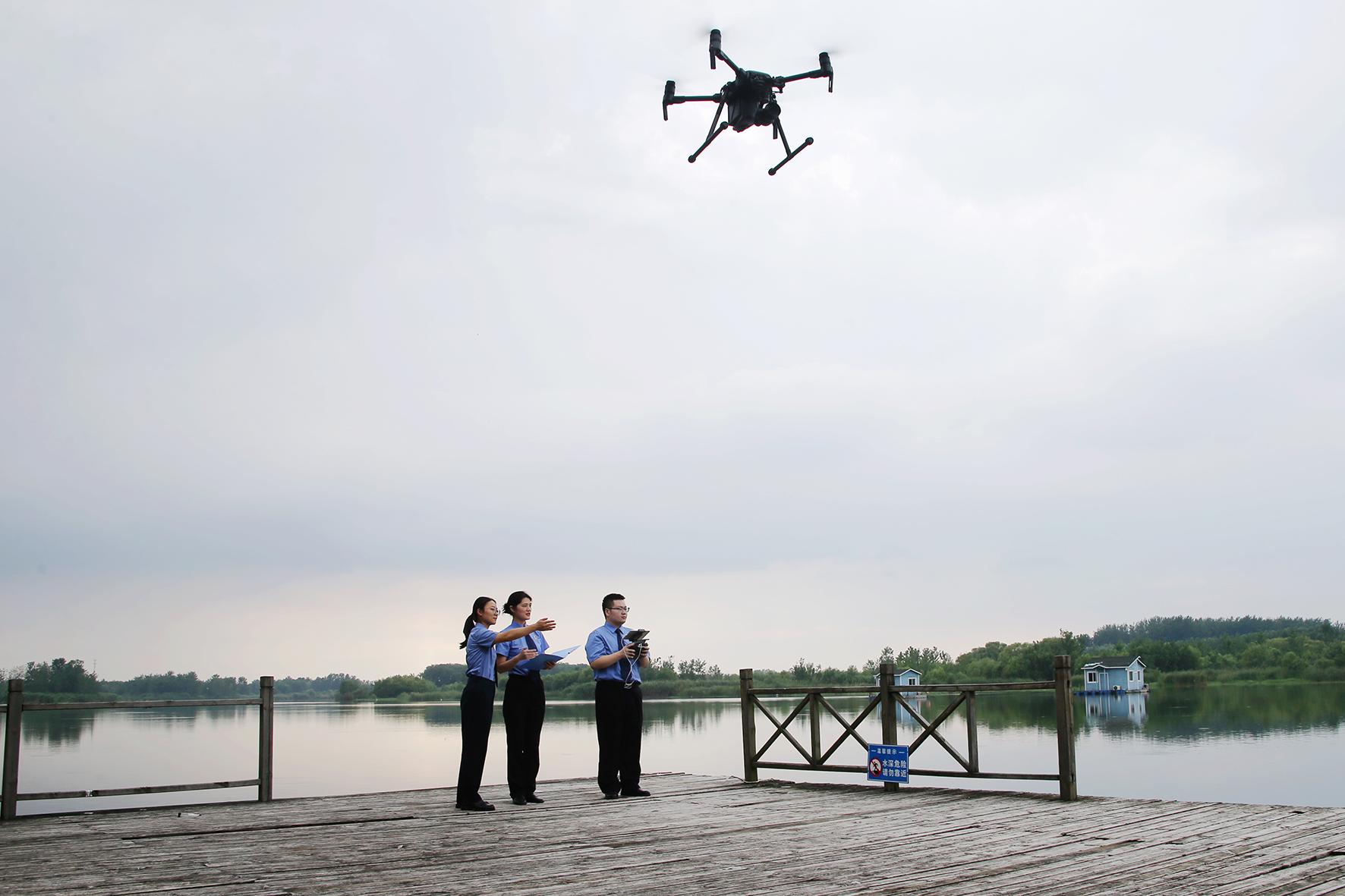 圖為8月12日,在全國生態(tài)日到來之際,公益訴訟辦案團(tuán)隊對古黃河飲用水源地開展無人機(jī)巡查。