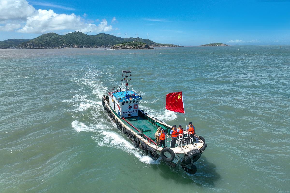 10月1日,浙江省舟山市岱山縣公安局羅家岙派出所民警堅守崗位,乘坐“紅帆110”船開展海上巡查行動,守護轄區(qū)平安。