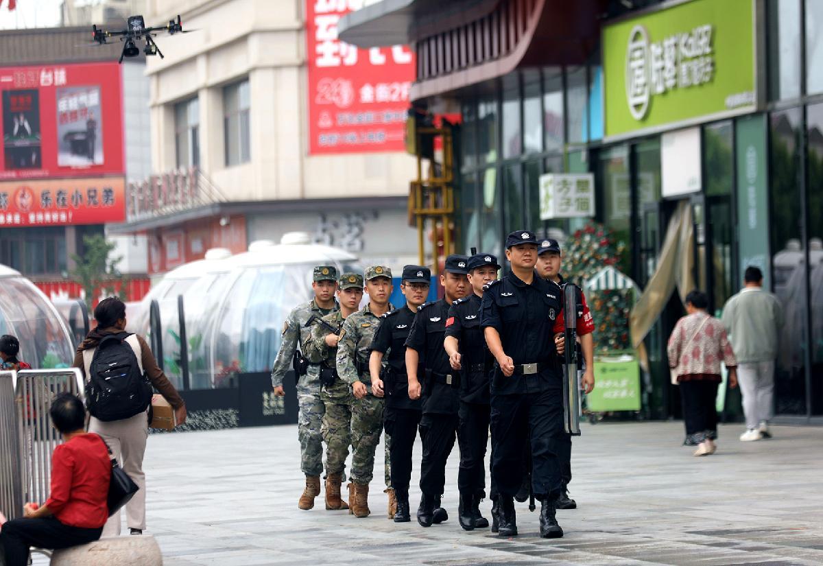 10月1日,安徽省舒城縣公安局特巡警聯(lián)合武警在商圈開展巡邏。