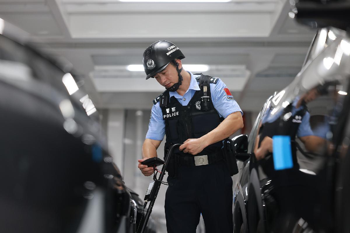 10月2日,江蘇邊檢總站太倉邊檢站民警對出口汽車進行查驗。