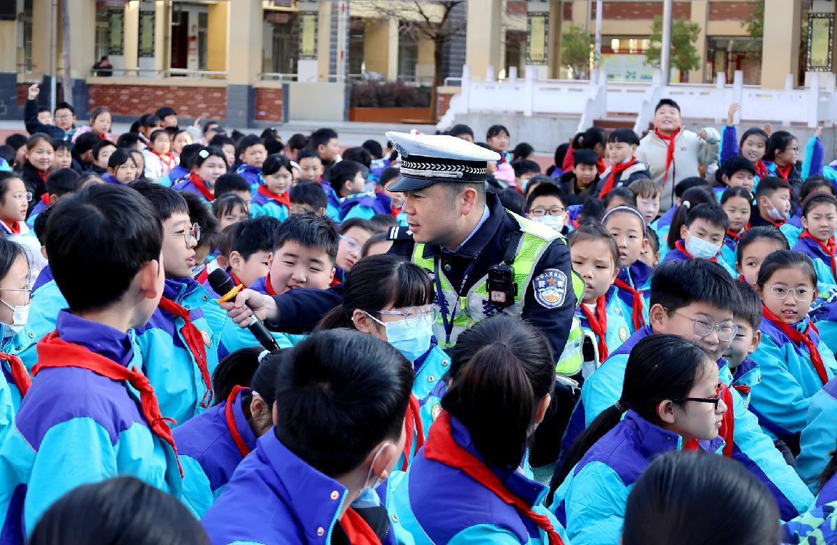 12月1日,在山東省棗莊市市中區(qū)光明路小學,棗莊市公安局市中分局交通管理大隊輔警為學生們普及交通安全知識。