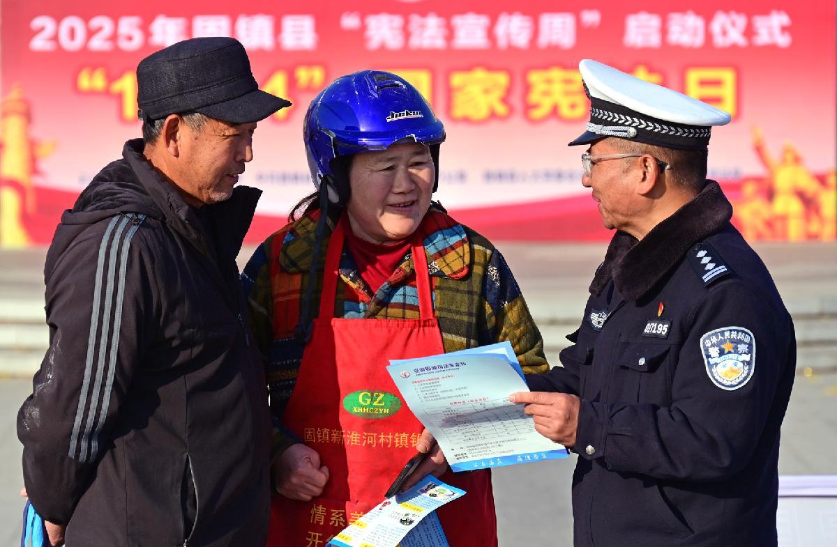 12月3日,安徽省蚌埠市固鎮(zhèn)縣公安局交管大隊(duì)民警在“憲法宣傳周”啟動儀式現(xiàn)場為群眾講解交通法規(guī)。