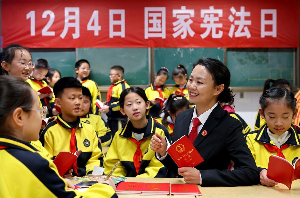 12月3日,在山東省棗莊市市中區(qū)文化路小學(xué),棗莊市市中區(qū)人民法院法官為學(xué)生講解憲法知識。