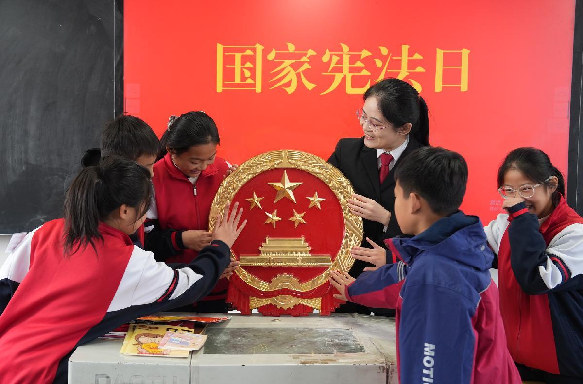 12月2日,在江蘇省興化市文峰小學(xué),興化市人民檢察院未成年人法治宣講團(tuán)工作人員為學(xué)生們講解憲法知識。