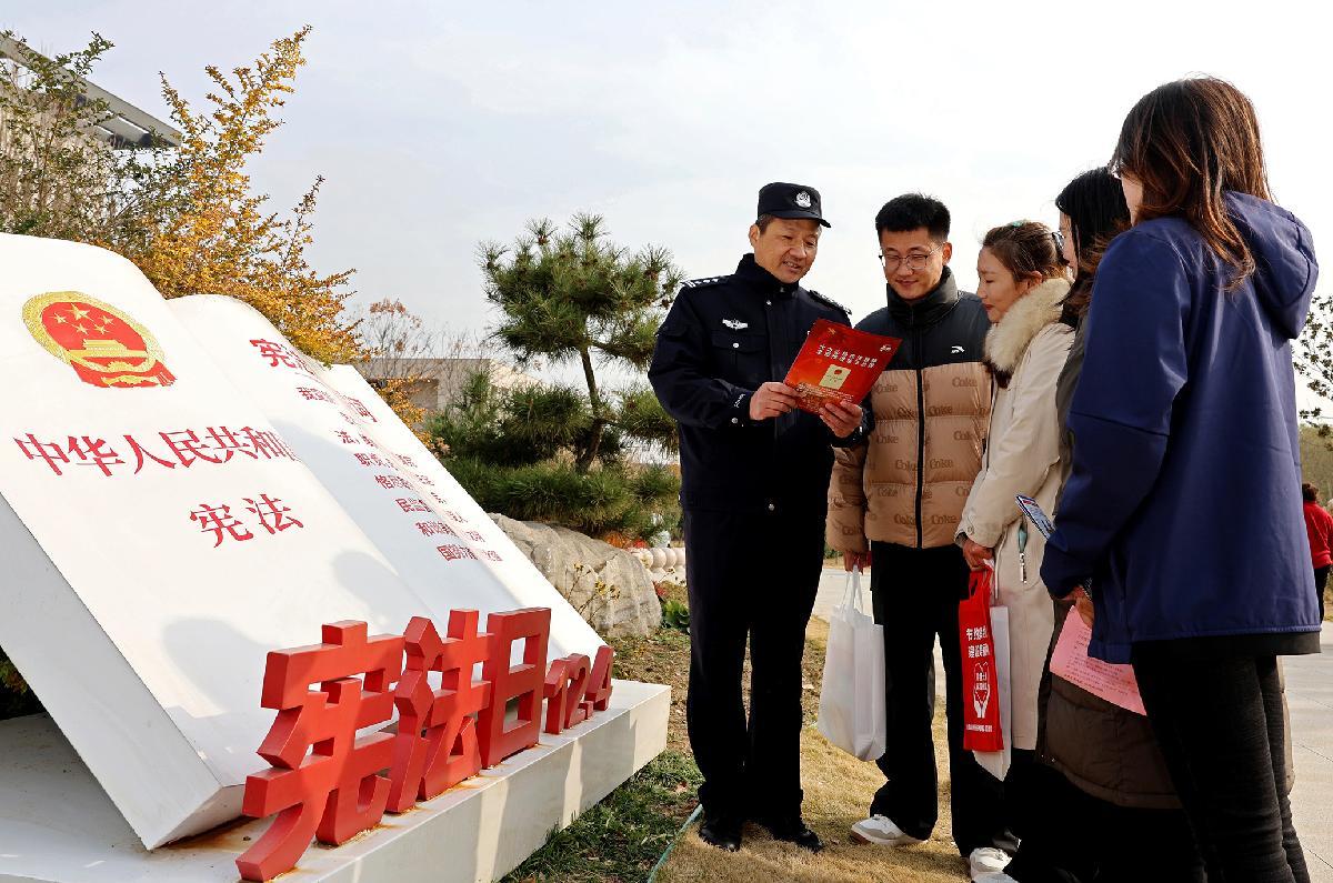 12月2日,山東省棗莊市公安局臺兒莊分局民警在憲法主題公園為群眾講解憲法知識。