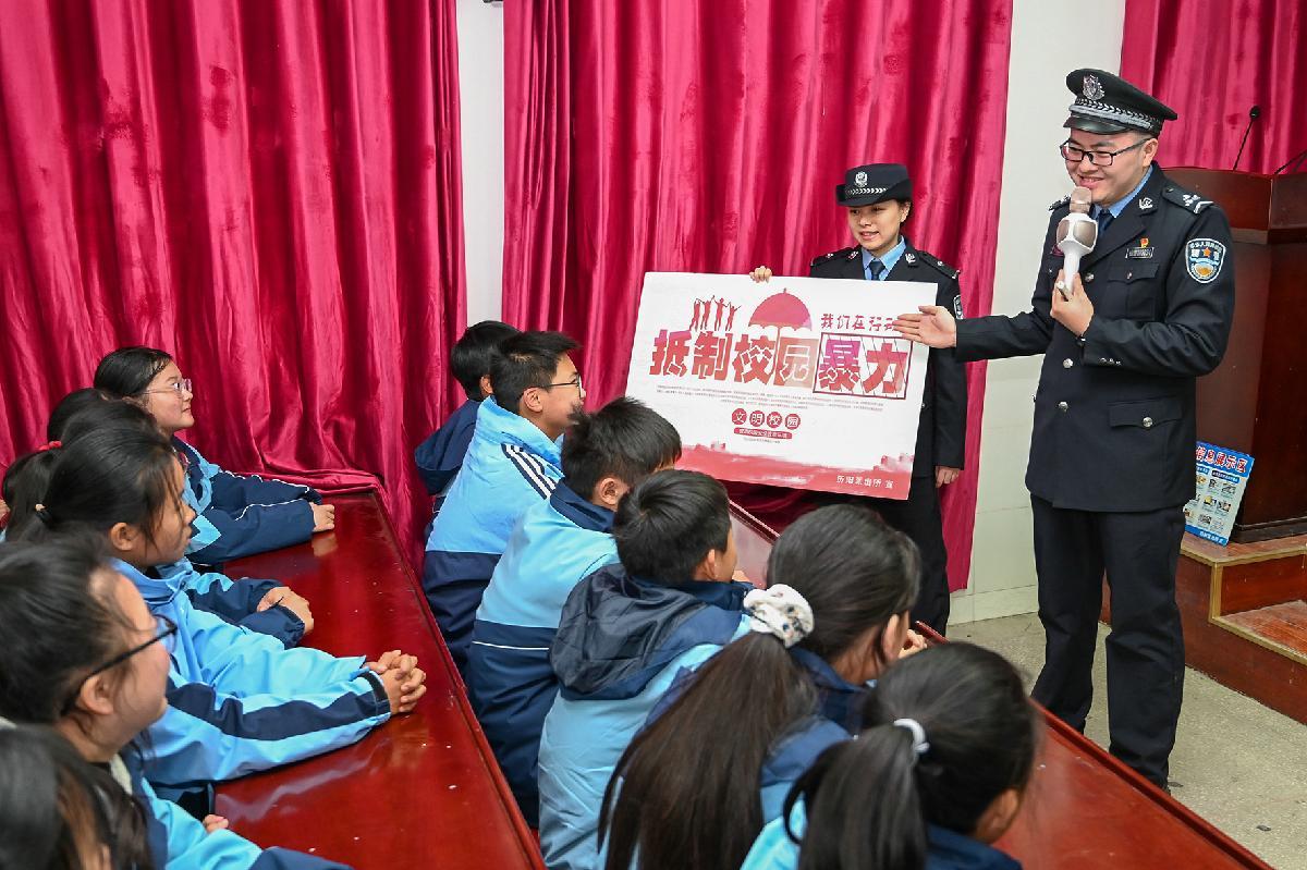 12月22日,安徽省馬鞍山市和縣公安局民輔警在功橋中學(xué)向?qū)W生講解預(yù)防校園欺凌知識(shí)。
