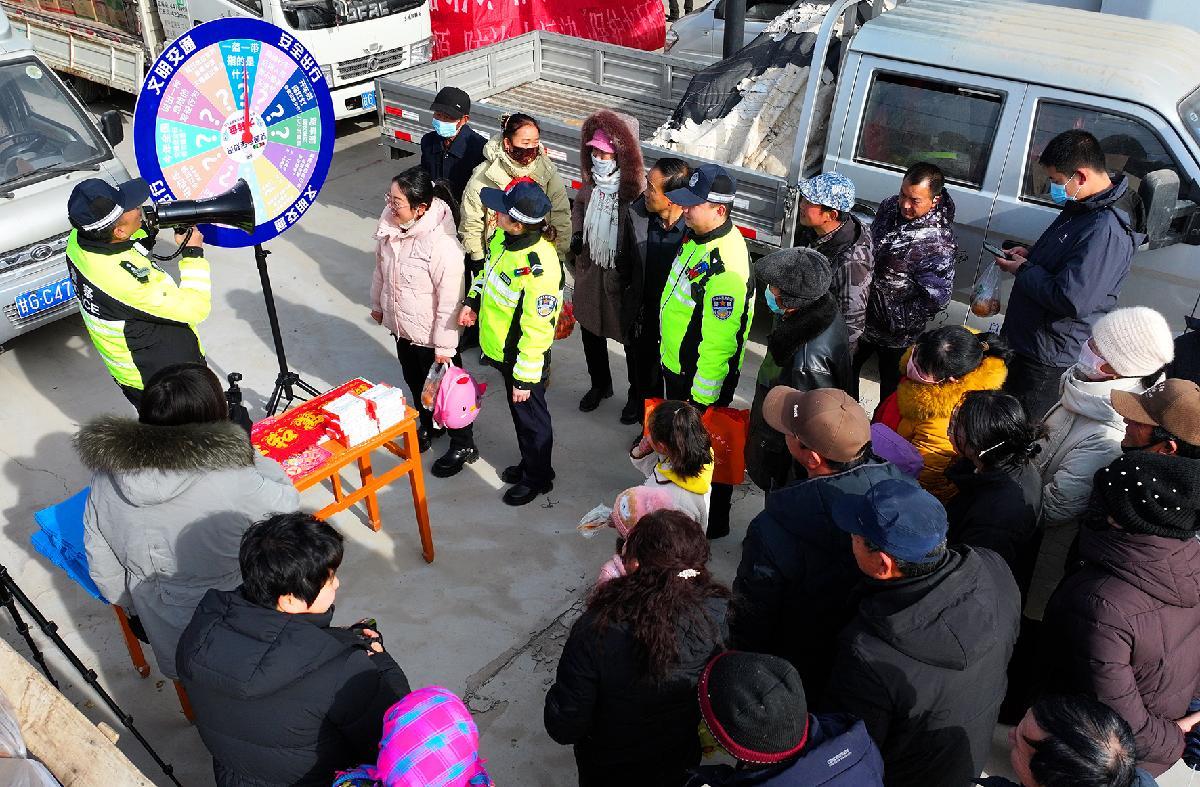 2月2日,甘肅省臨澤縣公安局交管大隊民輔警來到蓼泉鎮(zhèn)年貨市場,通過有獎競答、體驗VR、發(fā)放宣傳資料等方式開展交通安全宣傳。