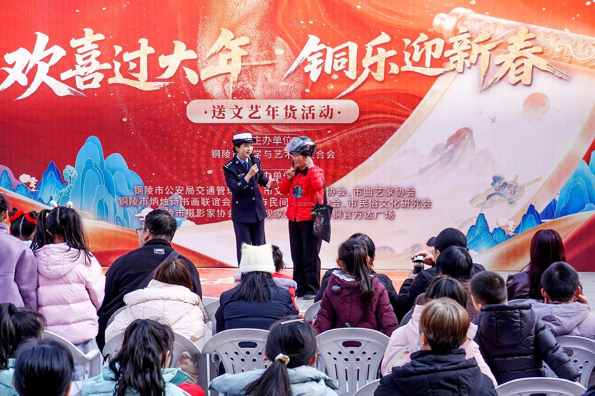 2月11日,安徽省銅陵市公安局交管支隊(duì)宣傳民警在“歡喜過大年 銅樂迎新春”銅都文藝集市活動現(xiàn)場,通過交通安全有獎競答、宣傳展臺講解、警民共創(chuàng)平安春聯(lián)等形式,將安全出行知識融入新春祝福,讓市民在喜慶氛圍中提升交通安全意識,共度平安祥和春節(jié)。