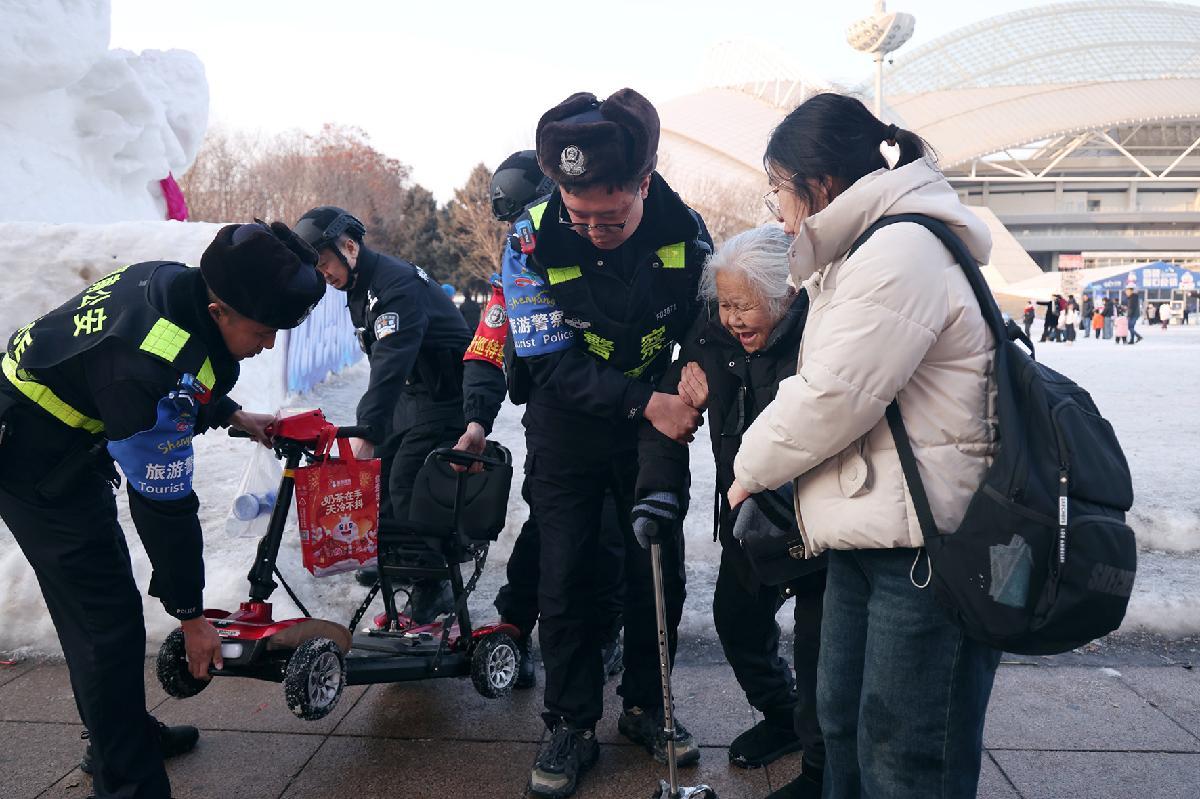 2月19日,遼寧省沈陽市公安局渾南分局巡特警大隊民輔警在奧體中心幫助行動不便的老人。