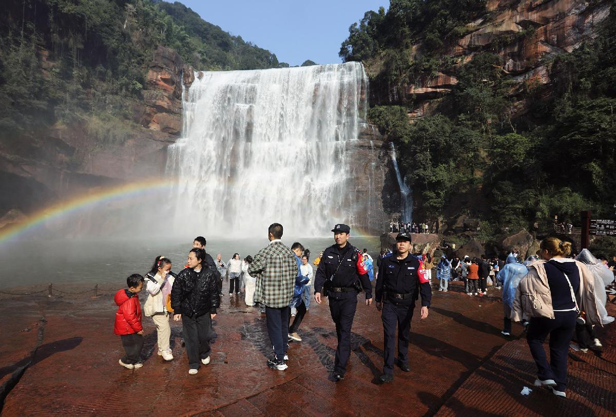 2月21日,貴州省赤水市公安局民警在赤水丹霞旅游區(qū)·大瀑布巡邏值守。