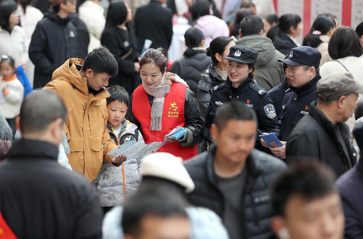 2月27日,在湖北省荊門市東寶區(qū)“春風(fēng)行動(dòng)”招聘會(huì)現(xiàn)場,荊門市公安局東寶區(qū)分局民警聯(lián)合龍泉街道禁毒志愿者,帶著禁毒宣傳手冊(cè)、仿真毒品模型,向求職者開展禁毒普法宣傳。