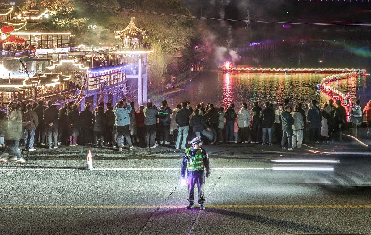 3月2日,浙江省武義縣公安局桃溪派出所民輔警在鬧元宵活動現場維護秩序。