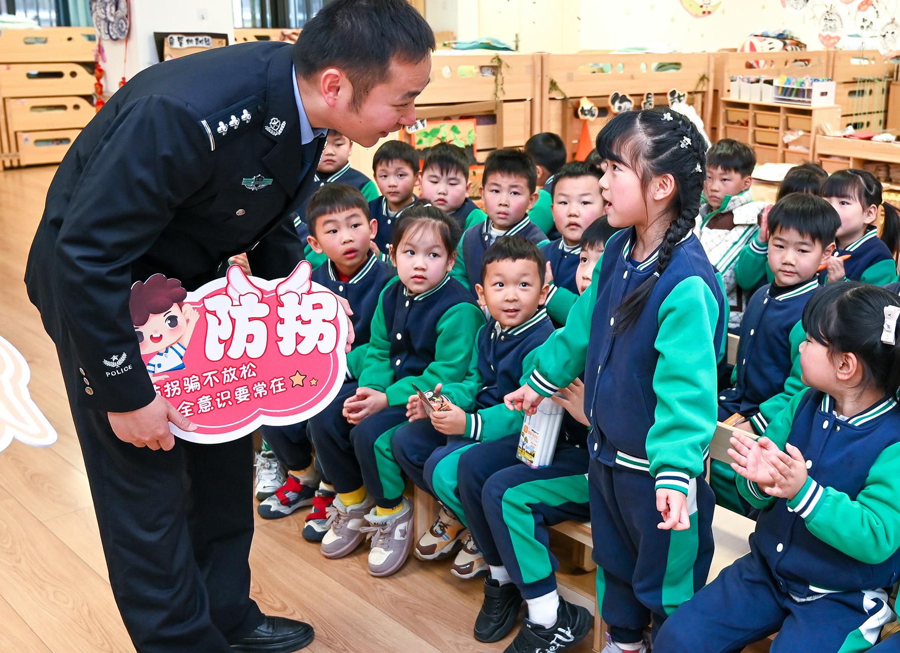 3月6日,安徽省阜南縣玉泉小學(xué)法治副校長、阜南縣公安局民警劉盛楠在校園為學(xué)生們宣講安全防范知識。