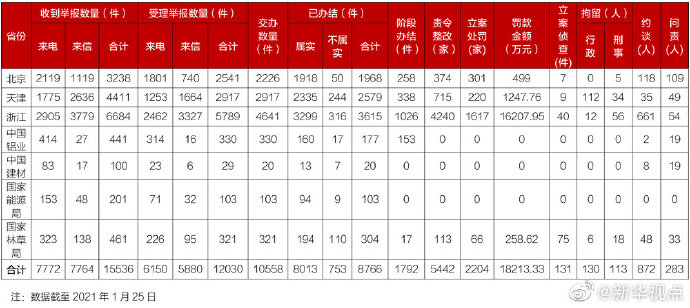 生態(tài)環(huán)境部29日通報(bào),截至2021年1月25日,第二輪第二批中央生態(tài)環(huán)保督察受理的群眾舉報(bào)已辦結(jié)8766件,處罰金額約18213.33萬元,立案?jìng)刹?31件,行政拘留130人,刑事拘留113人,約談872人,問責(zé)283人。(記者高敬,圖片來源:生態(tài)環(huán)境部)