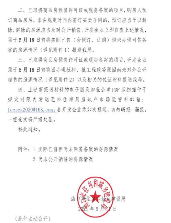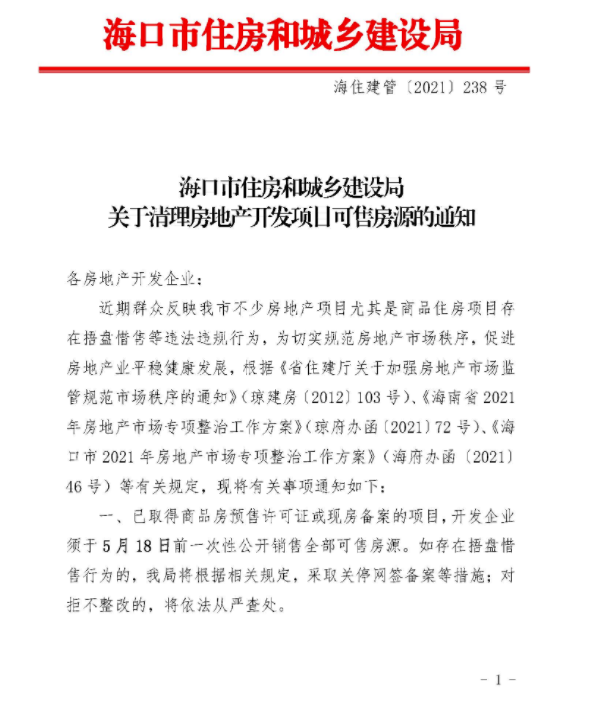 近日,海南省??谑凶》亢统青l(xiāng)建設(shè)局發(fā)布《關(guān)于清理房地產(chǎn)開發(fā)項(xiàng)目可售房源的通知》。