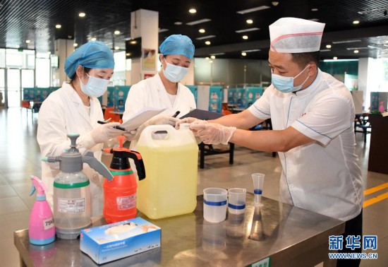 8月9日,在北京交通大學(xué)學(xué)生第二食堂,校醫(yī)院醫(yī)護人員(左、中)指導(dǎo)食堂工作人員進行消毒工作。
