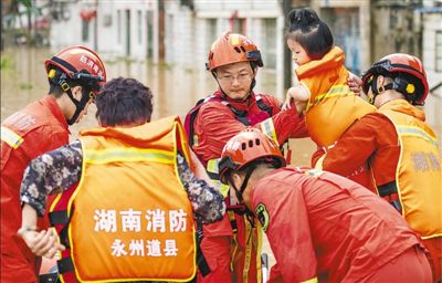 21日,湖南省永州市道縣西洲街道石廚頭社區(qū),消防救援人員在轉移群眾。