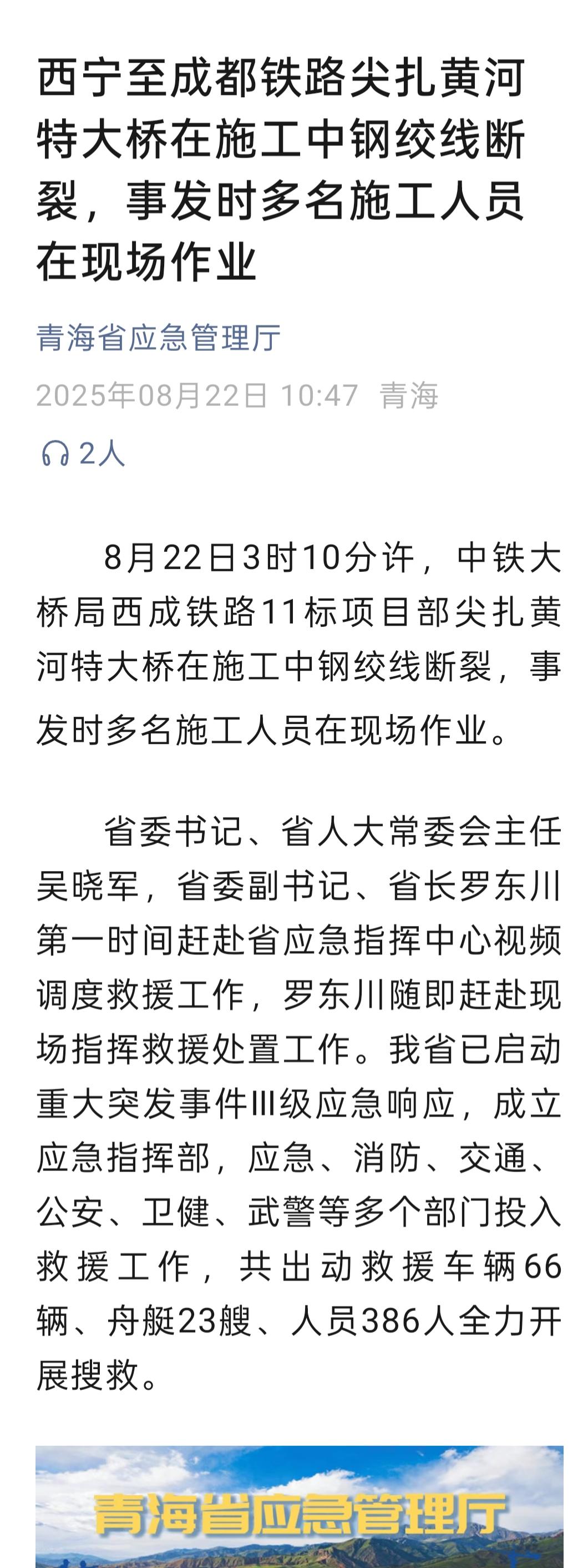 青海省應(yīng)急管理廳通報稱,8月22日3時10分許,中鐵大橋局西成鐵路11標項目部尖扎黃河特大橋在施工中鋼絞線斷裂,事發(fā)時多名施工人員在現(xiàn)場作業(yè)。青海省委書記、省人大常委會主任吳曉軍,省委副書記、省長羅東川第一時間趕赴省應(yīng)急指揮中心視頻調(diào)度救援工作,羅東川隨即趕赴現(xiàn)場指揮救援處置工作。青海省已啟動重大突發(fā)事件Ⅲ級應(yīng)急響應(yīng),成立應(yīng)急指揮部,應(yīng)急、消防、交通、公安、衛(wèi)健、武警等多個部門投入救援工作,共出動救援車輛66輛、舟艇23艘、人員386人全力開展搜救。