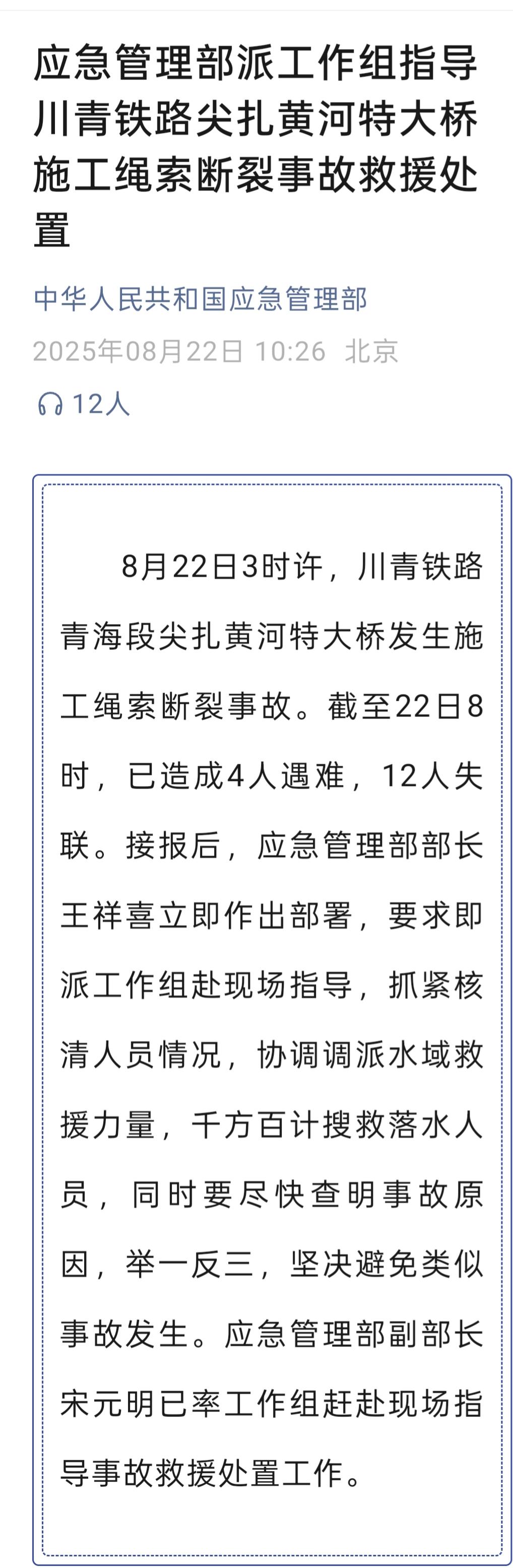 8月22日,應(yīng)急管理部發(fā)布消息,8月22日3時許,川青鐵路青海段尖扎黃河特大橋發(fā)生施工繩索斷裂事故。截至22日8時,已造成4人遇難,12人失聯(lián)。接報后,應(yīng)急管理部部長王祥喜立即作出部署,要求即派工作組赴現(xiàn)場指導,抓緊核清人員情況,協(xié)調(diào)調(diào)派水域救援力量,千方百計搜救落水人員,同時要盡快查明事故原因,舉一反三,堅決避免類似事故發(fā)生。應(yīng)急管理部副部長宋元明已率工作組趕赴現(xiàn)場指導事故救援處置工作。