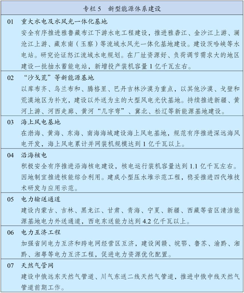 堅(jiān)持立足國內(nèi)、補(bǔ)齊短板、多元保障、強(qiáng)化儲備,加強(qiáng)能源產(chǎn)供儲銷體系建設(shè)。堅(jiān)持油氣核心需求自主保障,實(shí)施中長期油氣增儲上產(chǎn)戰(zhàn)略行動,確保原油年產(chǎn)量穩(wěn)定在2億噸左右、天然氣產(chǎn)量穩(wěn)步增長,加強(qiáng)煤制油氣產(chǎn)能和技術(shù)儲備。強(qiáng)化政府儲備和企業(yè)儲備協(xié)同,提升國家石油儲備規(guī)模,建立更加靈活的輪換動用機(jī)制,增強(qiáng)天然氣儲備調(diào)節(jié)保障能力,完善煤炭儲備體系。健全能源保供中長期合同制度,完善電力應(yīng)急調(diào)度機(jī)制和備用電源配置,強(qiáng)化能源需求側(cè)管理。加強(qiáng)戰(zhàn)略性礦產(chǎn)資源勘探開發(fā)和儲備,深入實(shí)施新一輪找礦突破戰(zhàn)略行動,統(tǒng)籌加強(qiáng)產(chǎn)品、產(chǎn)能和產(chǎn)地儲備,推動大宗商品儲運(yùn)基地建設(shè),提升戰(zhàn)略性礦產(chǎn)資源安全風(fēng)險(xiǎn)監(jiān)測預(yù)警和應(yīng)急保供水平。加強(qiáng)能源資源開發(fā)國際合作,維護(hù)戰(zhàn)略通道安全。