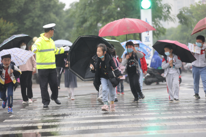 5月19日下午,安徽省舒城縣降雨并伴有霧天氣,舒城縣公安局交通管理大隊(duì)在學(xué)校周邊增派“護(hù)學(xué)崗”警力,確保學(xué)生出行安全。圖為該大隊(duì)二中隊(duì)“護(hù)學(xué)崗”輔警在轄區(qū)一學(xué)校附近呵護(hù)放學(xué)小學(xué)生安全過馬路。