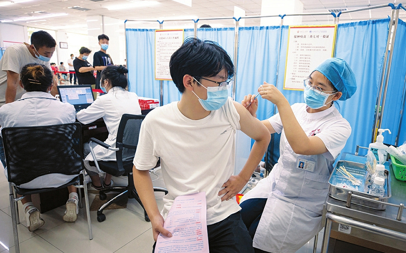 8月3日,在運(yùn)城市中心醫(yī)院新冠病毒疫苗接種門診,醫(yī)務(wù)人員正為適齡市民接種疫苗。當(dāng)前,根據(jù)全省統(tǒng)一部署,運(yùn)城市8月開始在15-17歲人群中接種新冠病毒疫苗。據(jù)悉,該市所有無(wú)禁忌癥的15-17歲人群,由學(xué)校統(tǒng)一組織或自行前往疫苗接種點(diǎn)接種,8月底前完成第一劑接種。(閆鑫攝)