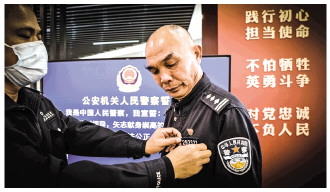 圖② 同事為鄭國慶卸下陪伴了他半生的警號,意味著他的職業(yè)生涯正式結(jié)束了。